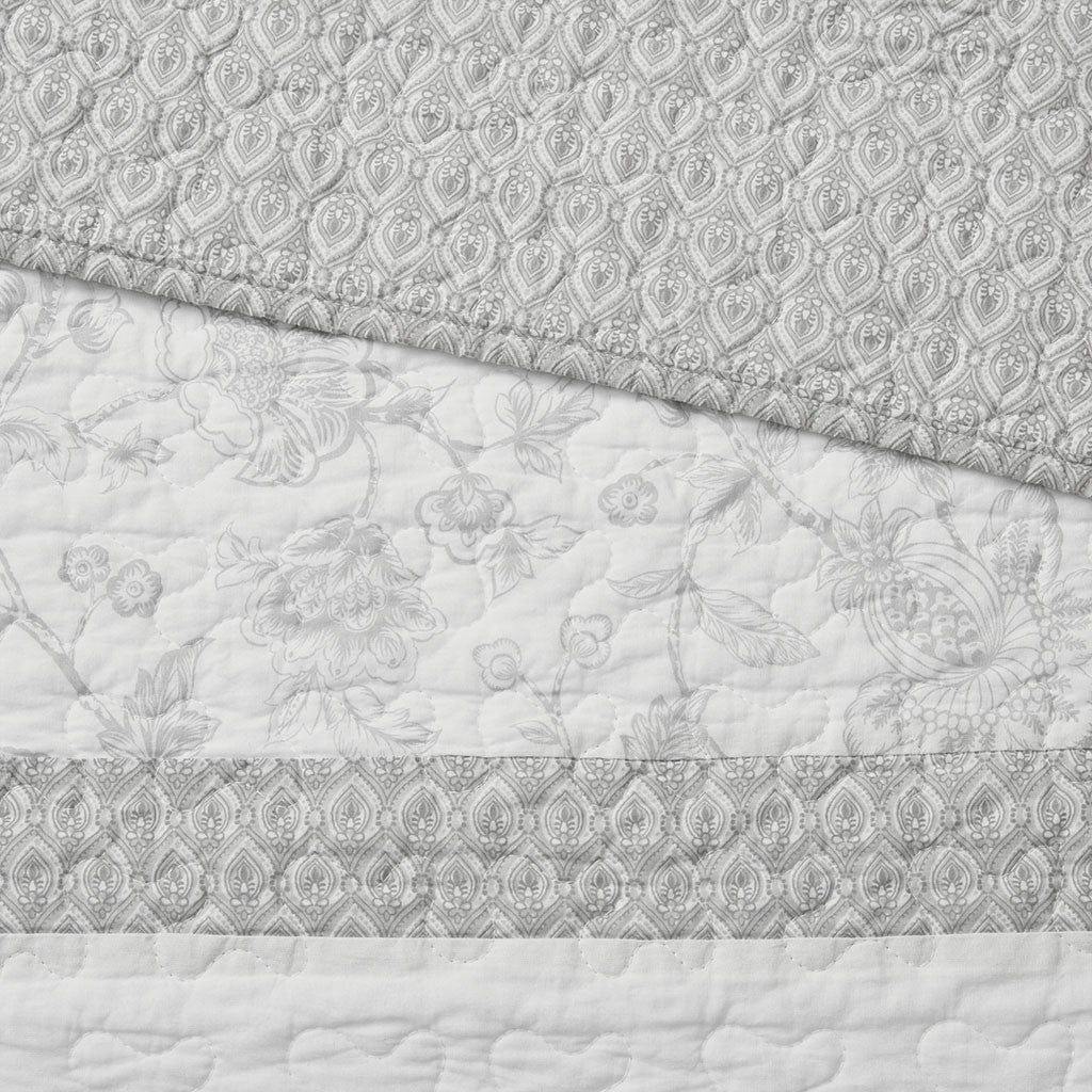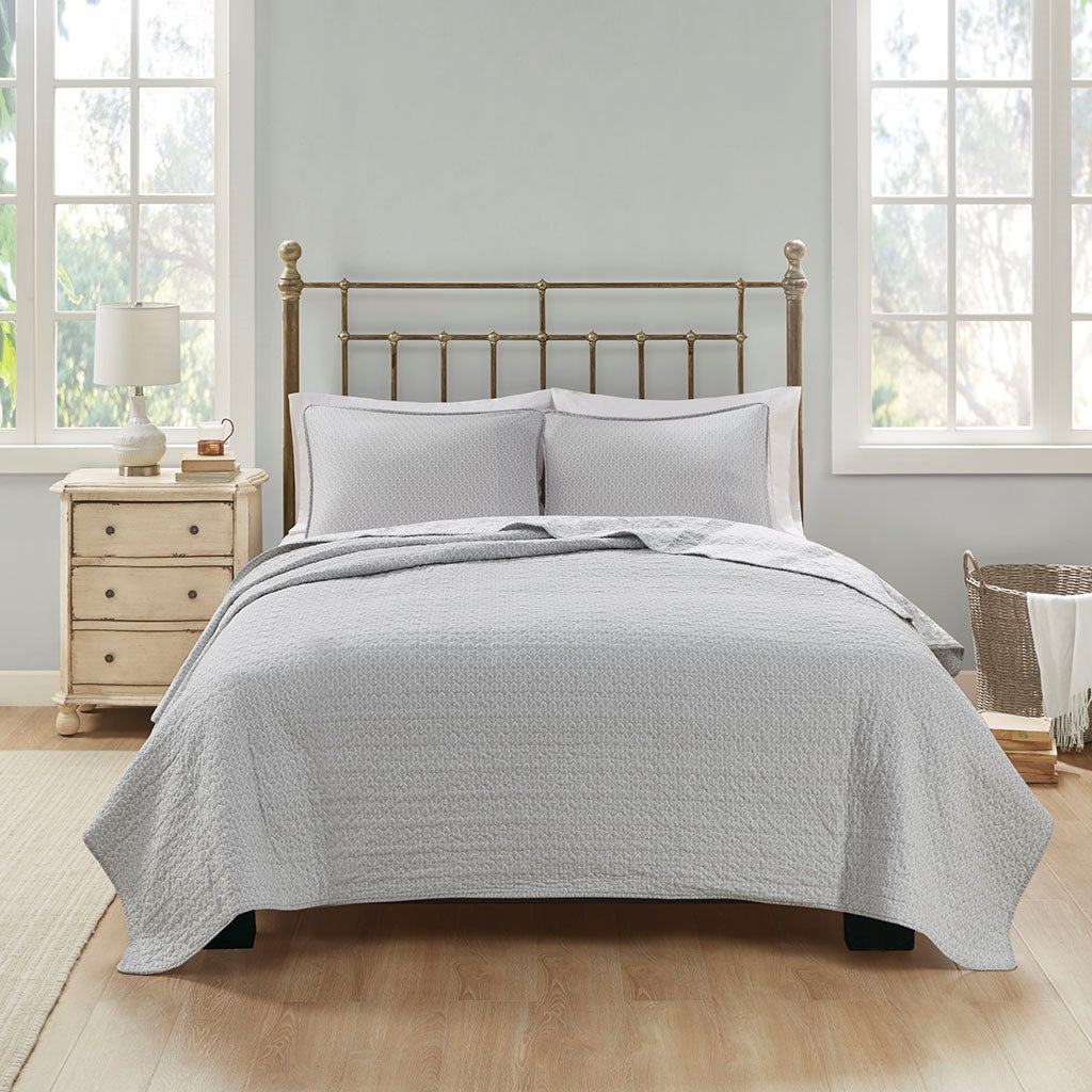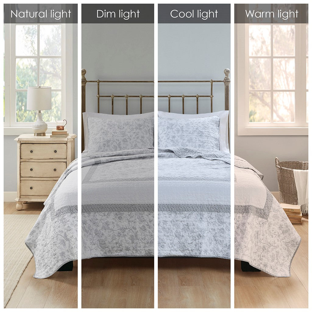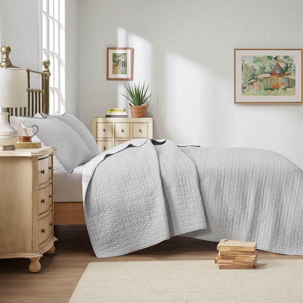 Give your bedroom a soft and cozy farmhouse update with the Madison Park Amber 3 Piece Coverlet Set. This reversible coverlet features a grey paisley print with a solid cream border to create a 2-tone charming cottage look. The 2 matching shams also showcase a paisley print to pair perfectly with the quilted coverlet. Machine washable for easy care, this reversible coverlet set is perfect for use in the summer time or as an extra layer to keep you warm in the winter. This farmhouse coverlet also has an antimicrobial treatment provides built-in freshness protection, inhibits growth of odor causing bacteria, and keeps the fabric newer, longer.