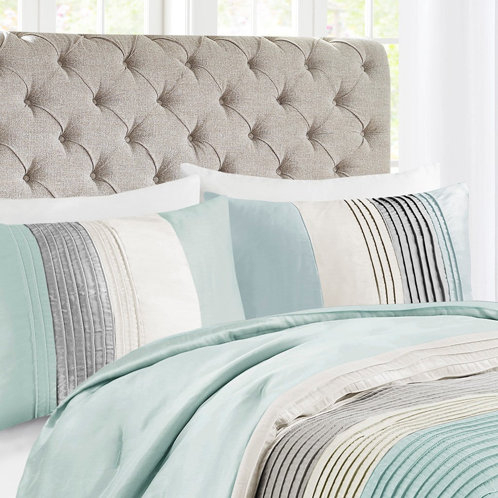 Amherst's modern color blocked design is a simple way to add style to your room. This comforter is covered in larges stripes in shades of aqua and grey. Made from polyester jacquard and a brushed fabric reverse this comforter is soft to the touch and is machine washable for easy care. The comforter set includes two matching standard shams and three decorative pillows that accent the color blocked look.