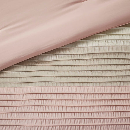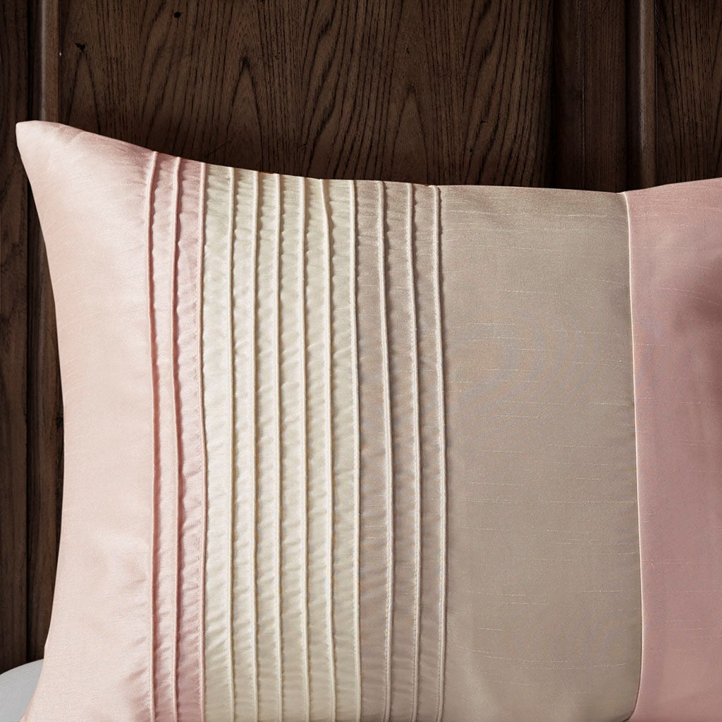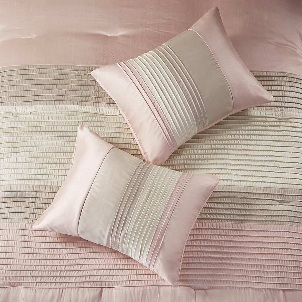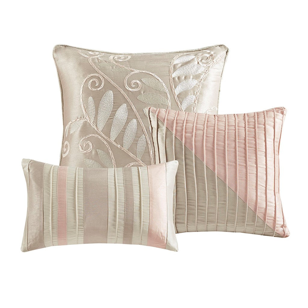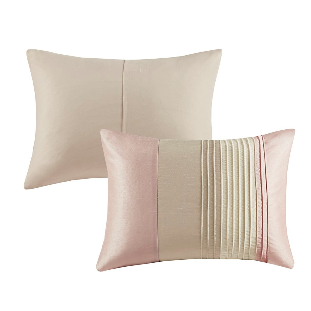 The Madison Park Amherst 7 Piece Comforter Set offers a beautiful update to your bedroom decor. The polyester faux silk comforter and shams features a pieced and pintucked design in blush, ivory, and taupe hues for a chic contemporary look. Two square decorative pillows and an oblong decorative pillow with embroidered and pintucked details complete the top of the bed, while a solid taupe bed skirt provides the perfect finishing touch. Hypoallergenic polyester filling in the comforter and decorative pillows provides exceptional warmth and comfort. Machine washable for easy care, this faux silk comforter set brings a rich and elegant touch to your bedroom.