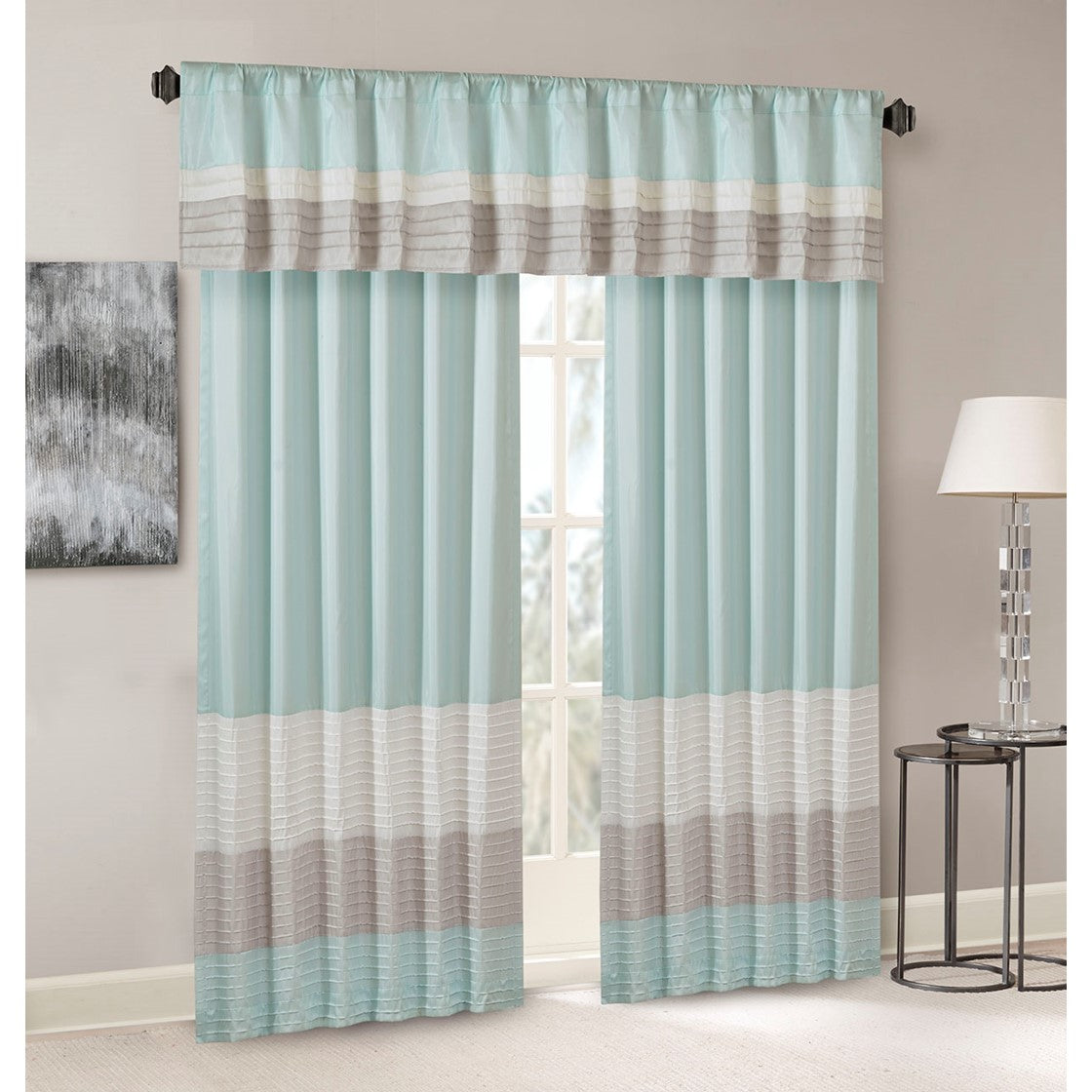 Amherst's modern color block design is a simple way to add style to any room. This window valance features color block stripes in soft hues of aqua, grey, and ivory combined with pintuck detailing for beautiful texture and dimension. Added lining helps to filter the perfect amount of light and creates a fuller look. Hang using the rod pocket top. Fits up to 1.25" diameter rod.