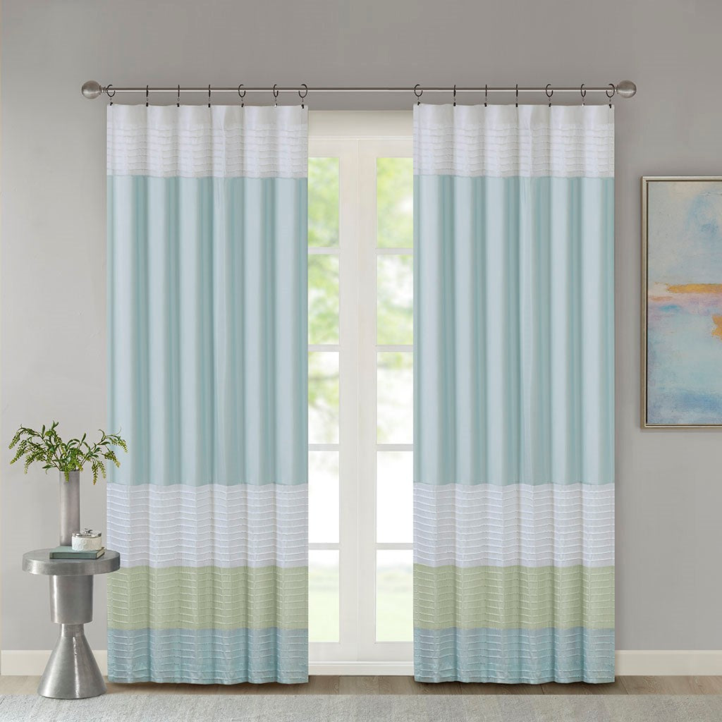 Madison Park Amherst Polyoni Pintuck Window Curtain is a simple way to add style to your room. This window panel features a modern striped design in soft hues of green, aqua, and ivory combined with pintuck detailing for beautiful texture and dimension. The added lining helps filter the perfect amount of light and creates fullness for better drapability. Simply hang using rod pocket or with back tabs for a tailored look. This window curtain fits up to a 1.25" diameter rod.