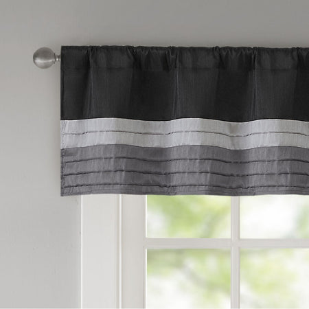 Madison Park Amherst Polyoni Pintuck Window Valance is a simple way to add style to your room. This window valance features a modern striped design in dark hues of black, charcoal, and silver combined with pintuck detailing for beautiful texture and dimension. The added lining helps filter the perfect amount of light and creates fullness for better drapability. Finished with a rod pocket top, this window valance fits up to a 1.25" diameter rod.