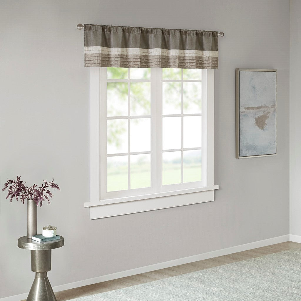 Madison Park Amherst Polyoni Pintuck Window Valance is a simple way to add style to your room. This window valance features a modern striped design in natural hues of ivory, taupe, and mocha combined with pintuck detailing for beautiful texture and dimension. The added lining helps filter the perfect amount of light and creates fullness for better drapability. Finished with a rod pocket top, this window valance fits up to a 1.25" diameter rod.