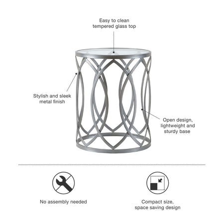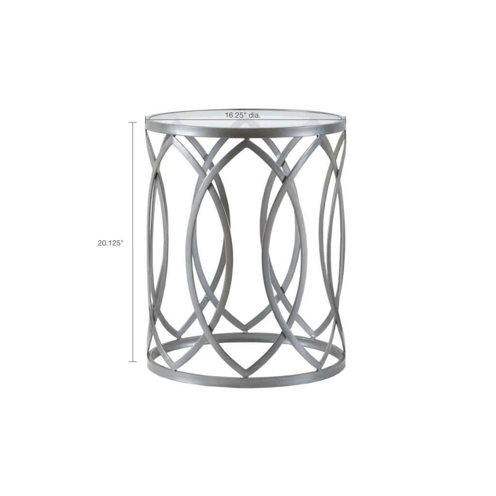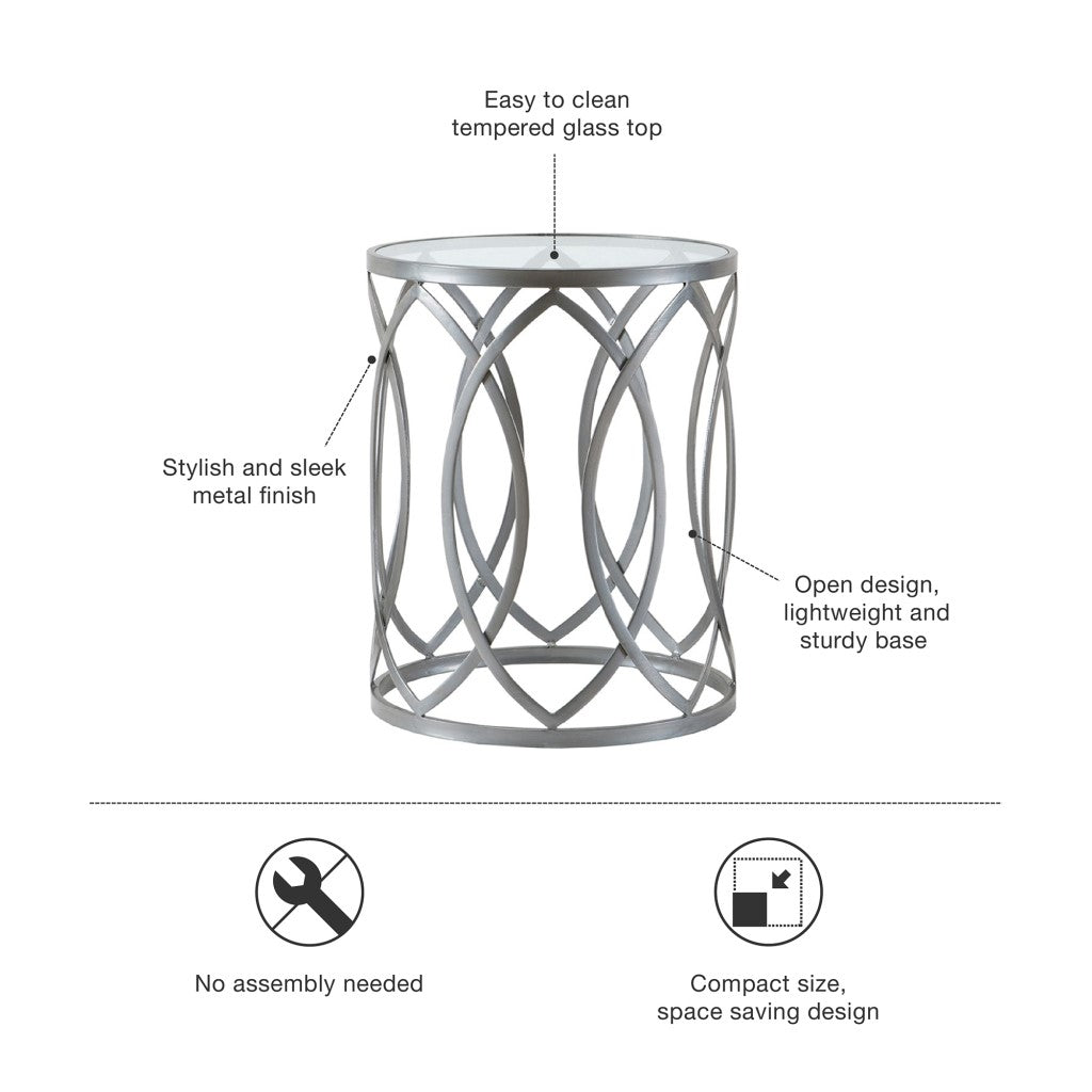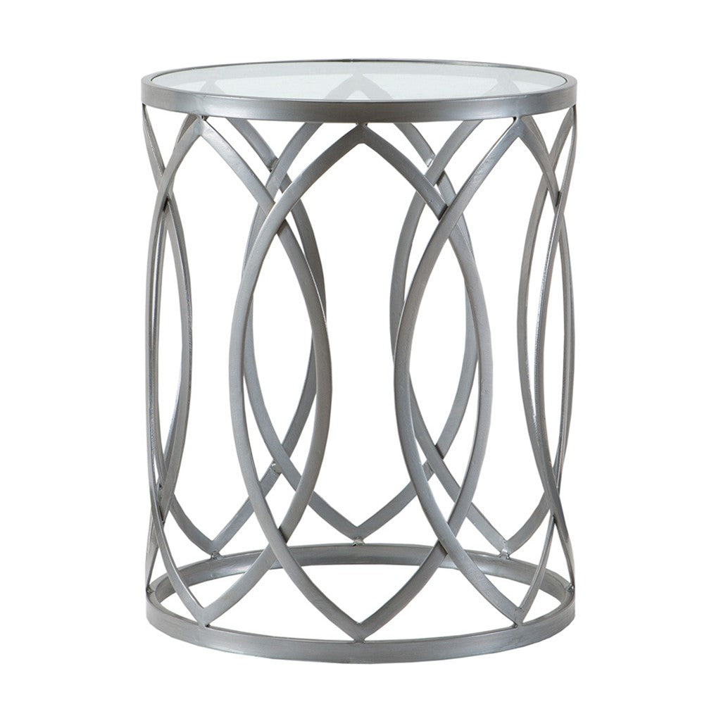 Update your home decor with the modern flair of the Madison Park Arlo Metal Eyelet Accent Table. This round metal accent table flaunts a geometric design with a grey metal finish to create a stunning contemporary look. A clear, tempered glass table top completes this metal accent table. Eye-catching with a unique design, this metal eyelet accent table adds a gorgeous modern touch to your living space. Comes fully assembled.