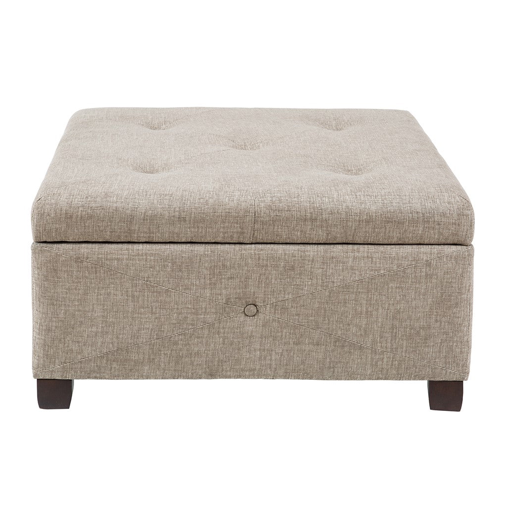 The Madison Park Aspen Ottoman offers a versatile storage option that's full of style for your home. This square storage ottoman is upholstered in a sand color fabric and features button-tufted details on the top and sides that add an elegant touch. Solid wood legs with a dark brown finish complement the upholstery. Providing ample storage space for your blankets and other essentials, this upholstered ottoman makes a great addition to any room in your home. Assembly required.