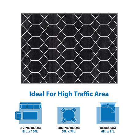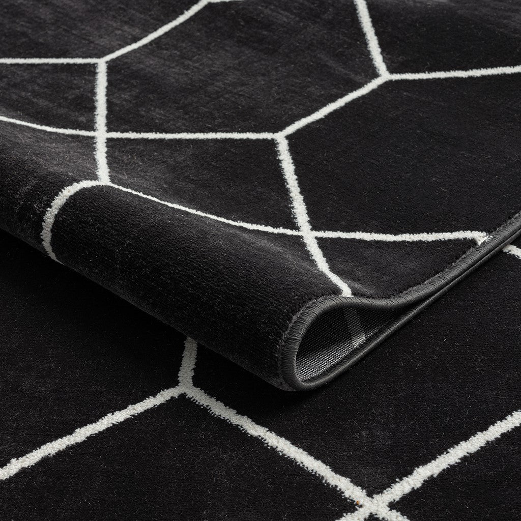 Elevate your home with the modern flair of Madison Park's Averie Trellis Geometric Black and Cream Woven Area Rug. Made in Turkey, this area rug features a black and cream geometric trellis pattern creating a bold contrasting look. The soft, medium pile makes the woven rug well suited for high traffic areas, while the transparent sprayed latex reverse helps keep the rug from sliding. A rug pad is still highly recommended to keep the rug in place. Stain and fade resistant, this woven area rug is OEKO-TEX certified, meaning it does not contain any harmful substances or chemicals to ensure quality comfort and wellness. Rug is available in multiple sizes, which makes it perfect for your living room, family room, or entryways. To clean, use a vacuum or spot clean.