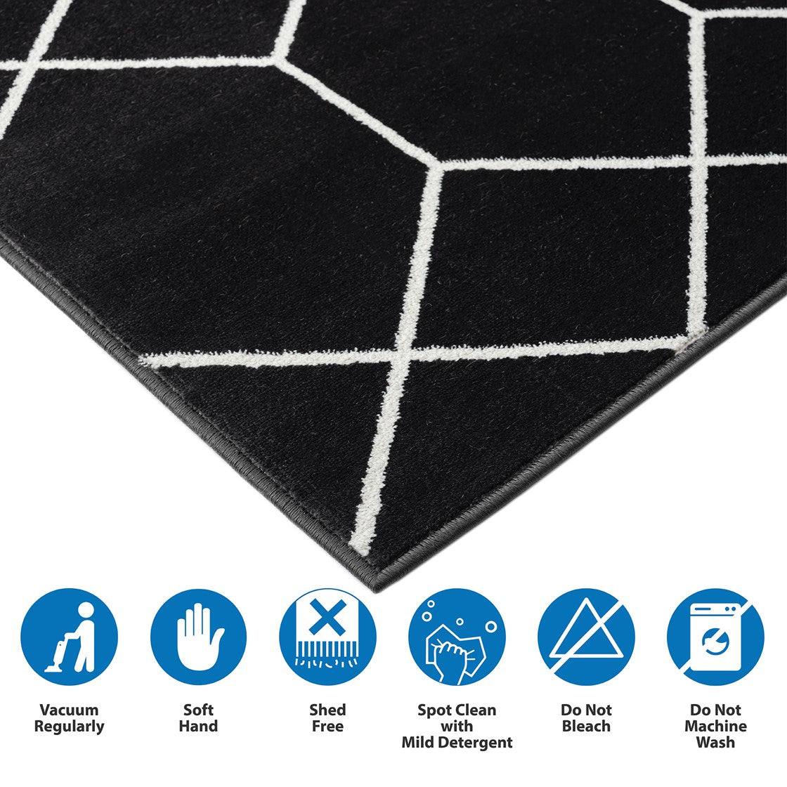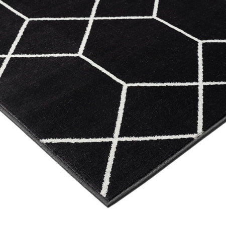 Elevate your home with the modern flair of Madison Park's Averie Trellis Geometric Black and Cream Woven Area Rug. Made in Turkey, this area rug features a black and cream geometric trellis pattern creating a bold contrasting look. The soft, medium pile makes the woven rug well suited for high traffic areas, while the transparent sprayed latex reverse helps keep the rug from sliding. A rug pad is still highly recommended to keep the rug in place. Stain and fade resistant, this woven area rug is OEKO-TEX certified, meaning it does not contain any harmful substances or chemicals to ensure quality comfort and wellness. Rug is available in multiple sizes, which makes it perfect for your living room, family room, or entryways. To clean, use a vacuum or spot clean.