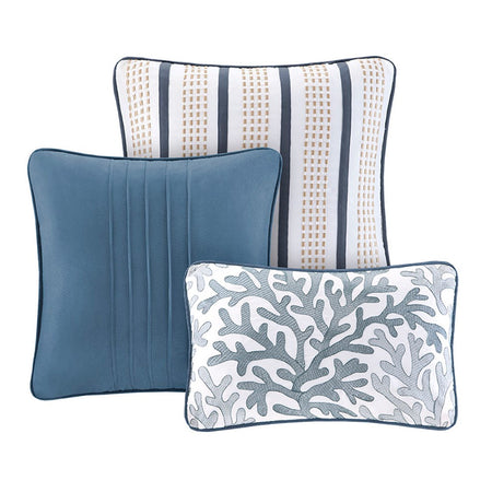 Create a coastal getaway right in your bedroom with the Reversible Bayside Coverlet Collection. Made from polyester microfiber the coverlet and sham feature assorted seashells accentuated with light and dark blue coloring on an ivory background. In a deep taupe color, a coral motif is printed on the background to give another dimension to this pattern. The reverse of both the coverlet and sham is the same corresponding dark blue from the face. Three decorative pillows use pleating and embroidery details for added value to this coverlet collection.
