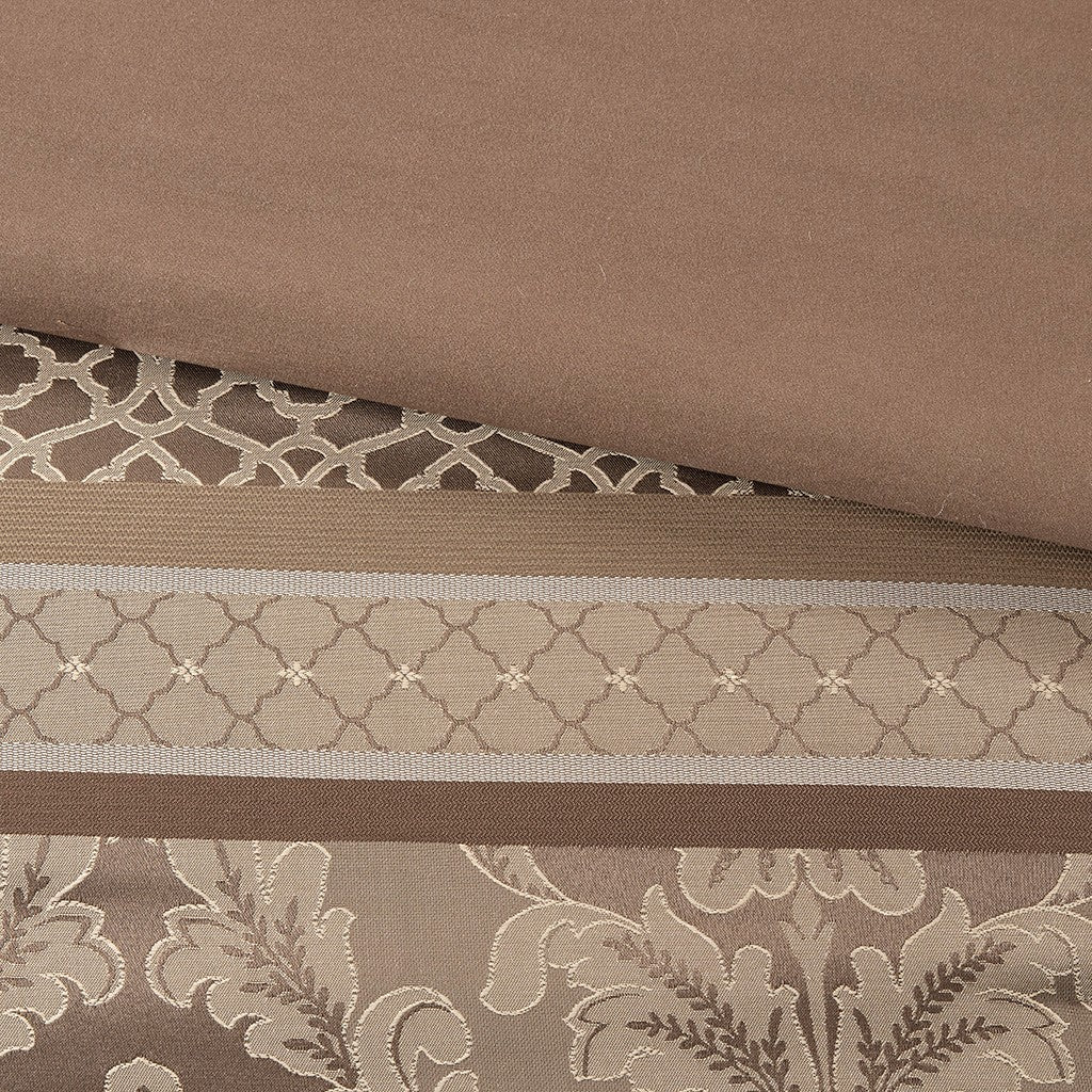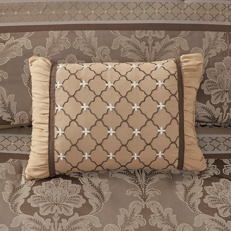 To add a touch of richness to your current decor, the Madison Park Bellagio 7 Piece Comforter Set offers a luxurious update to your room. Made from polyester jacquard, the comforter and shams share leaf, striping and ironwork motifs that are accentuated by elegant stitching. Pops of silver are also used throughout this collection adding a lavish feeling to your decor. Three decorative pillows feature pleating and embroidery details that correspond back to the comforter, while a rich bed skirt helps bring the entire look together.