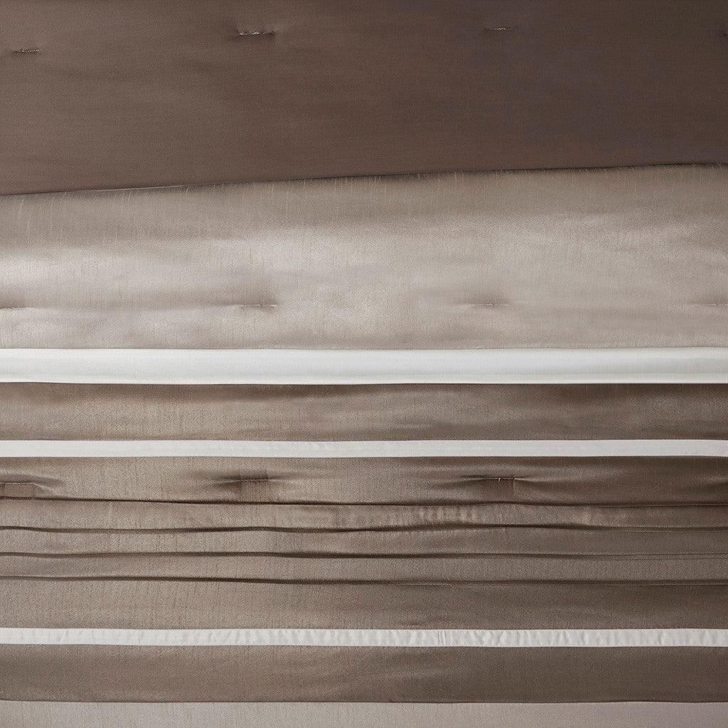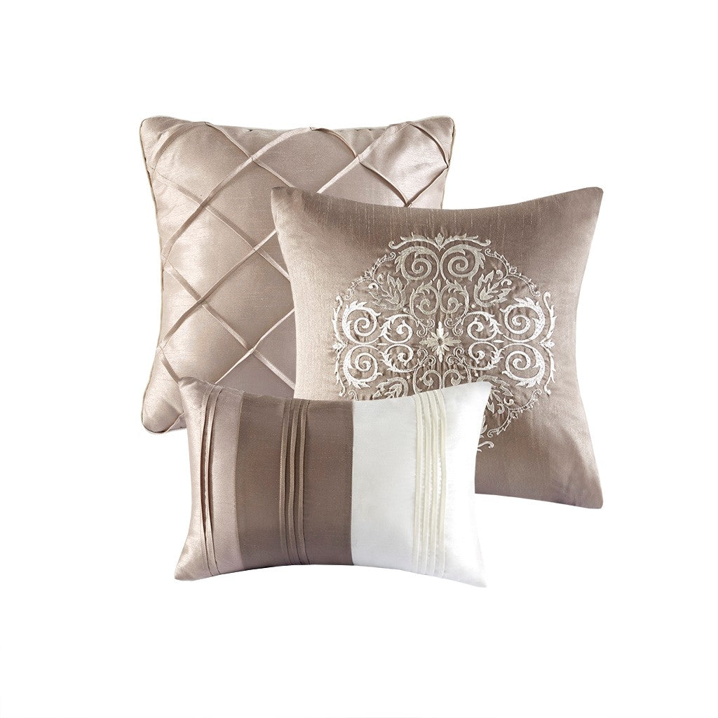 The Madison Park Blaire 7 Piece Comforter Set offers a rich traditional update to your bedroom decor. The comforter and matching shams feature pieced lustrous silk fabric and pintucking details, in tan and taupe hues, to create a stunning traditional look. Two square decorative pillows and an oblong decorative pillow with embroidered and pintucked details add rich textural touches to the top of the bed. A solid taupe bedskirt provides the finishing to the luxurious comforter set. Hypoallergenic filling in the comforter and decorative pillows provides exceptional warmth and comfort. Great for year-round use, this pieced faux silk comforter set brings a gorgeous and sophisticated look to your bedroom decor and is machine washable for easy care.