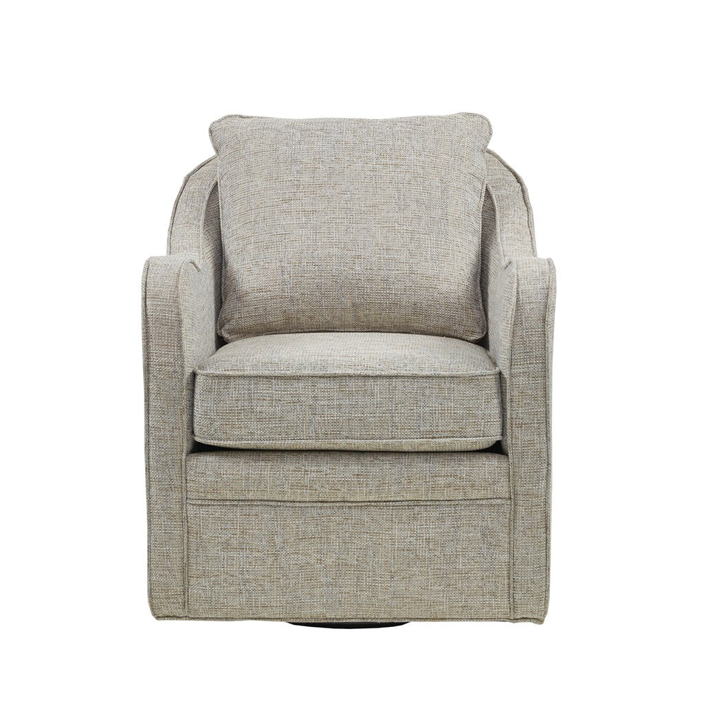Bring simple comfort to your living room decor with the Madison Park Brianne Wide Seat Swivel Arm Chair. This swivel chair features a loose back and seat cushion that is fully upholstered for a chic transitional look. Double piping details along the frame accent the design, while a black metal base allows the chair to smoothly rotate 360 degrees. Showcasing a clean silhouette and wide seat, this swivel arm chair provides a comfortable update to your home decor. Comes fully assembled.