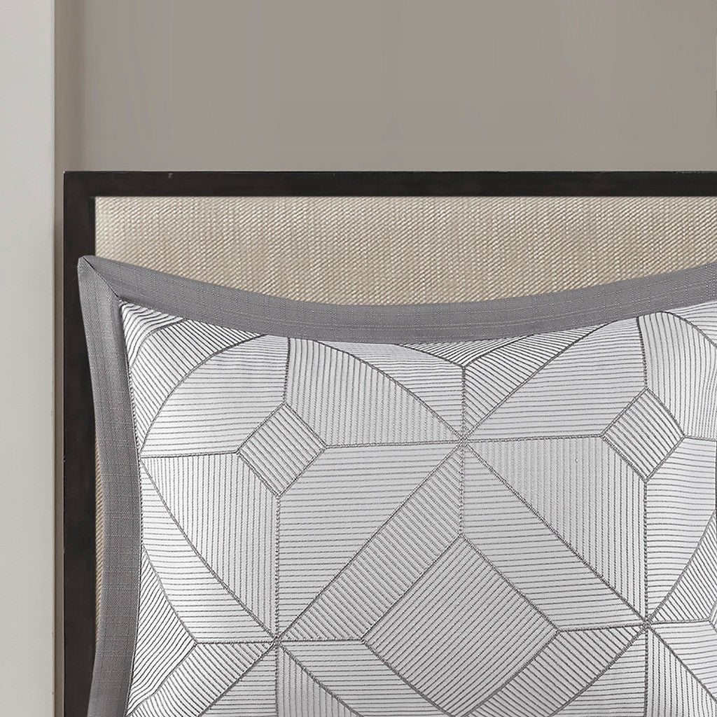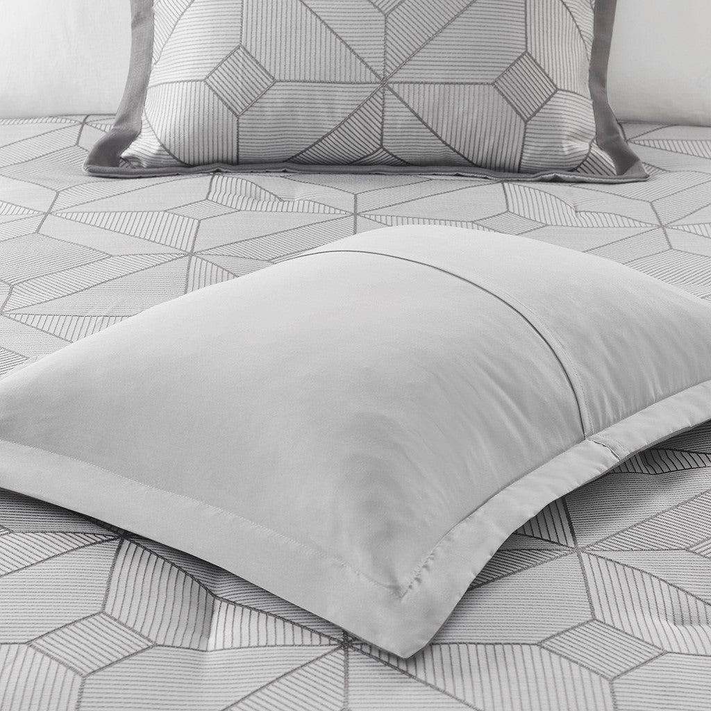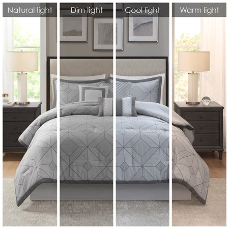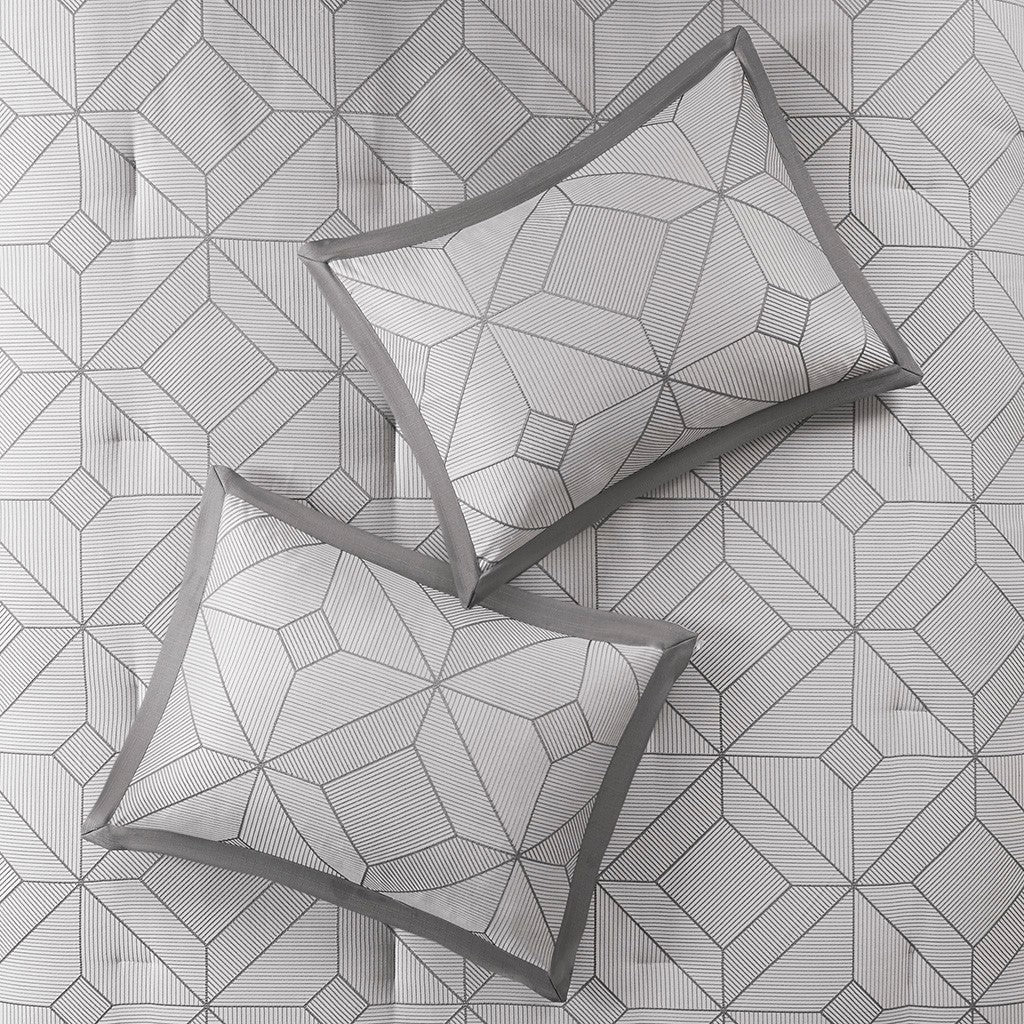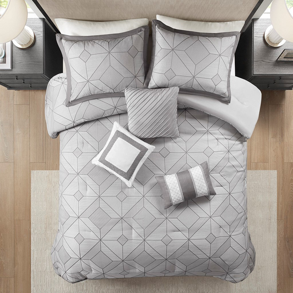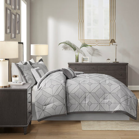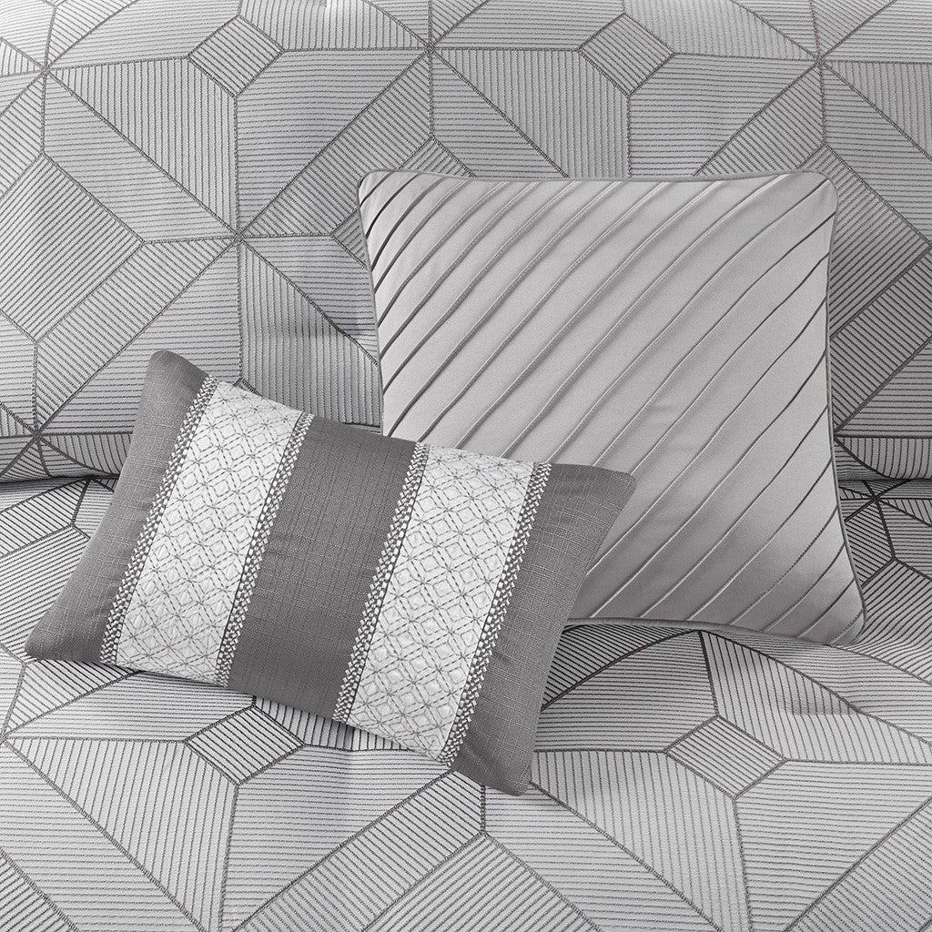 Madison Park's Cannon 7 Piece Jacquard Comforter Set offers a refined and sophisticated update to your bedroom. This jacquard comforter features gray geometric designs with a soft microfiber reverse that adds comfort, for a chic luxurious look. The two matching shams also showcase a geometric pattern to complement the transitional style comforter. Also included are three decorative pillows and a solid gray bed skirt that add the finishing touches to complete the glam bedding set. Hypoallergenic polyester filling in the comforter and pillows provide exceptional warmth and comfort. Machine washable for easy care, this jacquard comforter set brings an elevated touch to your bedroom decor.