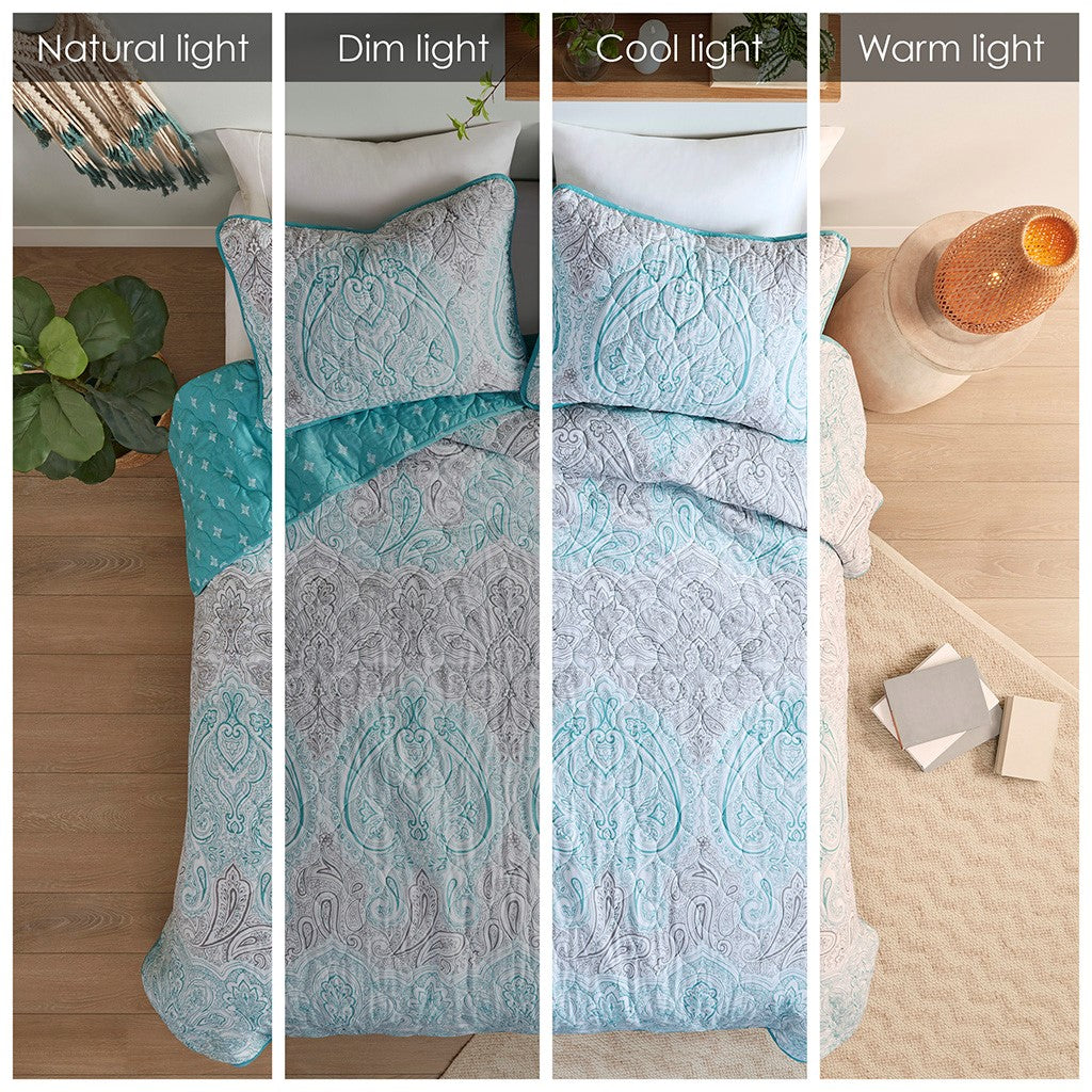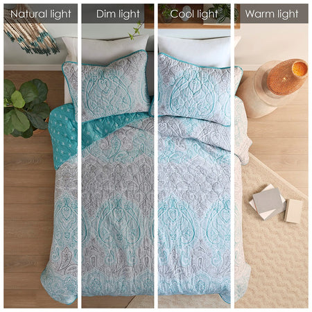The Madison Park Cardi 3 piece Reversible Cotton Coverlet Set offers fresh boho style update to your bedroom decor. This cotton coverlet features a repeating medallion design on the face with a teal reverse, for a charming shabby chic look. The 2 matching shams reiterate the pattern of the reversible coverlet to complete the transitional coverlet set. Machine washable for easy care, this reversible cotton coverlet is OEKO-TEX certified, meaning it does not contain any harmful substances or chemicals to ensure quality comfort and wellness. It also has an antimicrobial treatment that provides built-in freshness protection, inhibits growth of odor causing bacteria, and keeps the fabric newer, longer.