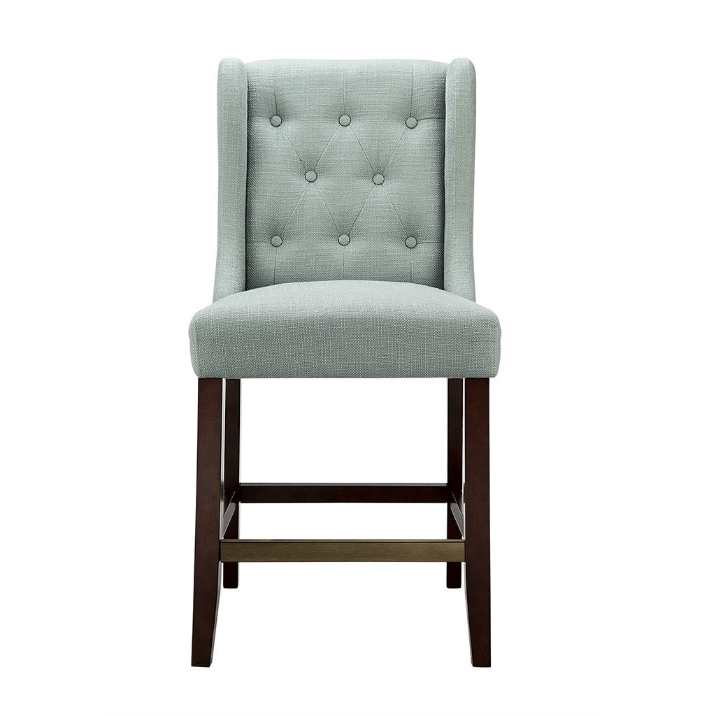 This beautiful button-tufted counter stool is upholstered in a beautiful woven fabric that coordinate perfectly with several different decor styles. Assembly required.