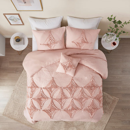 Create a relaxing vibe in your bedroom with the Madison Park Colette 4 Piece Comforter Set. The blush comforter flaunts an applique diamond design that adds dimension and a quilting diamond pattern to create a sophisticated shabby chic look. The 2 matching shams also feature a diamond applique touch to complement the comforter, while 1 coordinating decorative pillow completes the comforter set. Machine washable for easy care, this shabby chic comforter set adds a charming and casual update to your bedroom.