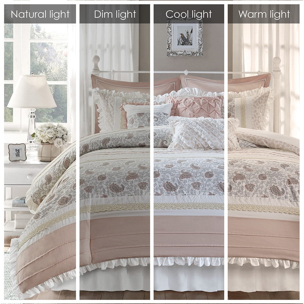 The Madison Park Dawn 9 Piece Cotton Percale Comforter Set offers a shabby chic update to your bedroom decor. A paisley print is featured on the cotton comforter with pintucked fabric separated by lace taping embellishments. Around the edge, a ruched flange adds a graceful touch, for a charming cottage look. Matching shams mirror the design of the comforter, while two solid Euro shams complement the top of the bed. Three decorative pillows and a solid bedskirt complete this farmhouse comforter set. This bedding set is also OEKO-TEX certified, meaning it does not contain any harmful substances or chemicals to ensure quality comfort and wellness. A coordinating shower curtain is available and sold separately. Items in the set may come in a rolled or compressed packaging, which will need to be fluffed up or steam ironed before use to remove wrinkles.