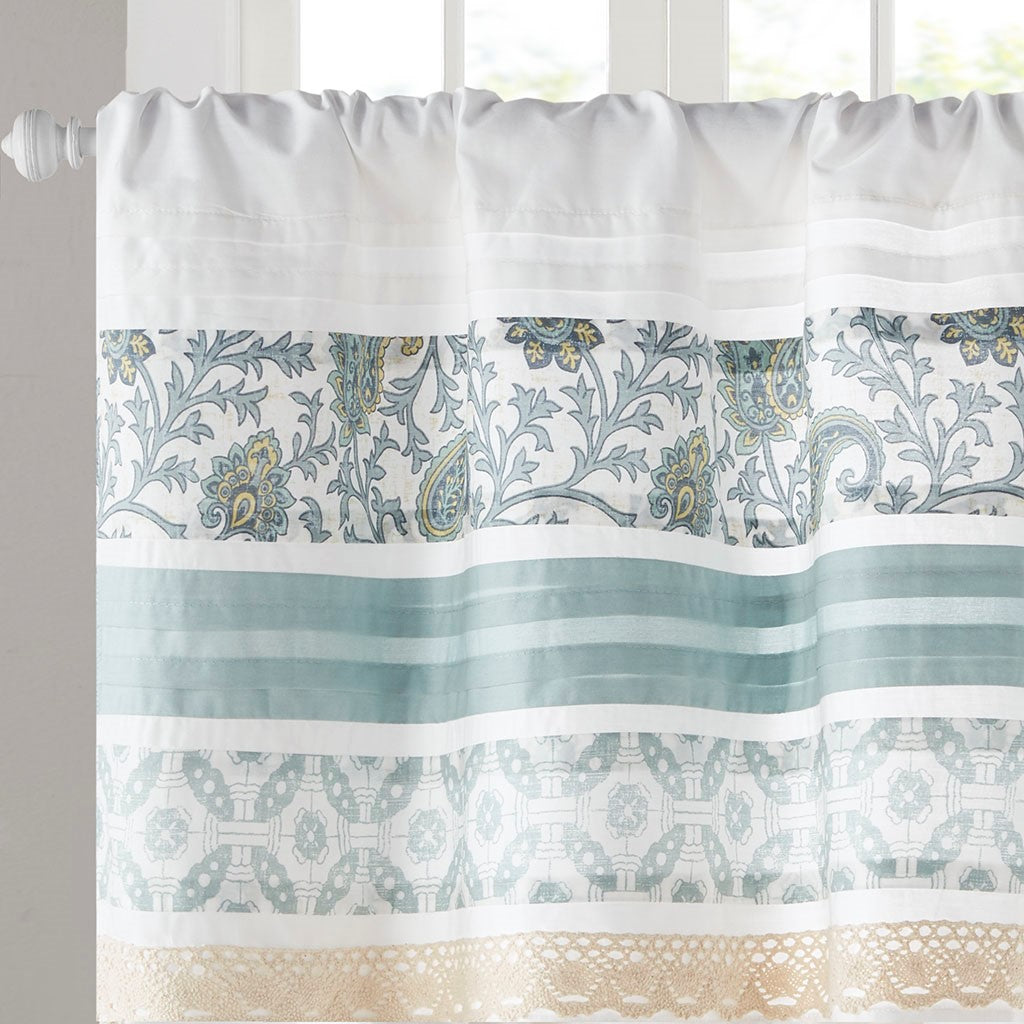 Shabby chic in all the right ways, our Madison Park Dawn Kitchen Tier Setare the perfect update for your kitchen. The paisley print and delicate pieced design showcases a soft color palette of blue, periwinkle, and white hues, finished with a lace trim for additional charm and texture. This kitchen tier is also OEKO-TEX certified, meaning it does not contain any harmful substances or chemicals, ensuring quality comfort and wellness. Made from 100% cotton for natural appeal, these kitchen tiers feature a rod pocket that fits up to 1.25" diameter rod. Complete the look with coordinate valance as show in image, available and sold separately.