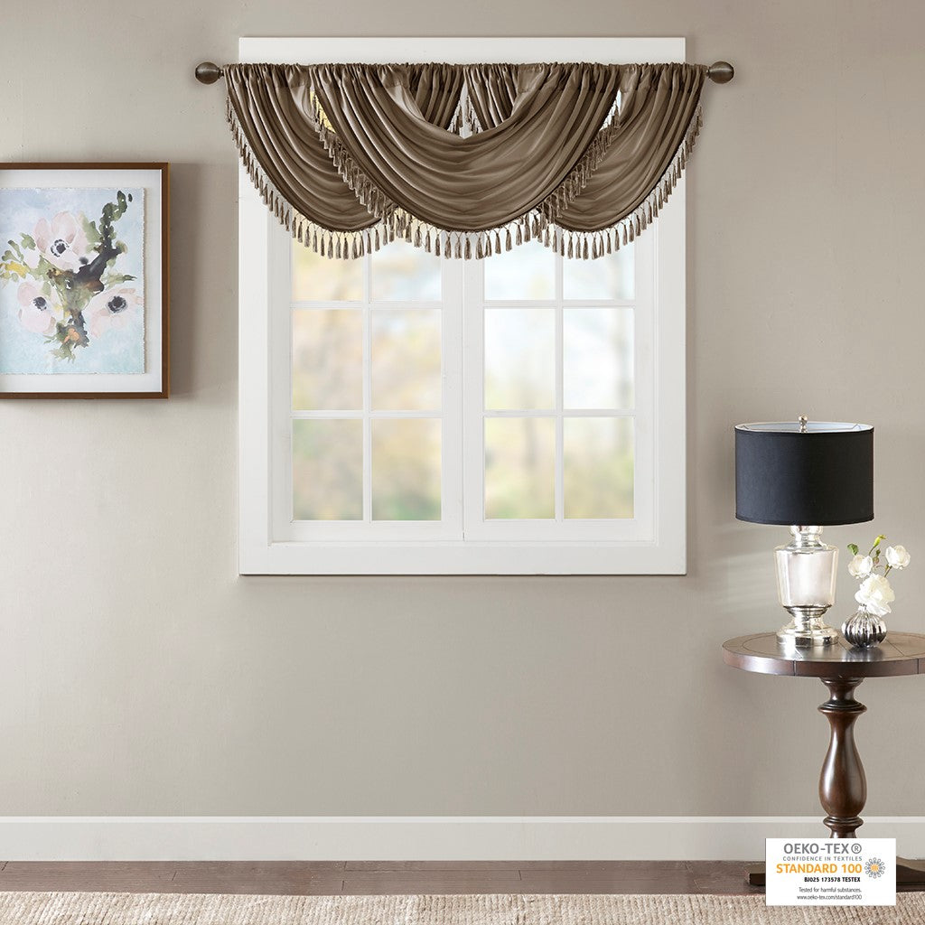 Bring style and sophistication to your windows, with our Elena Waterfall window valance. This classy bronze valance showcases rich center draping details and a beautiful tassel trim, combined with the faux silk fabric for a rich sheen and stylish update. Features added lining and a rod pocket top finish; fits up to 1.25" diameter rod. Part of our decorative valance collection, this valance is perfect as a stylish addition to any small window or even better as a layering piece to dress up any window panel. This window valance is also OEKO-TEX certified, meaning it does not contain any harmful substances or chemicals, ensuring quality comfort and wellness. Need to purchase 3 valances to create same look as image.