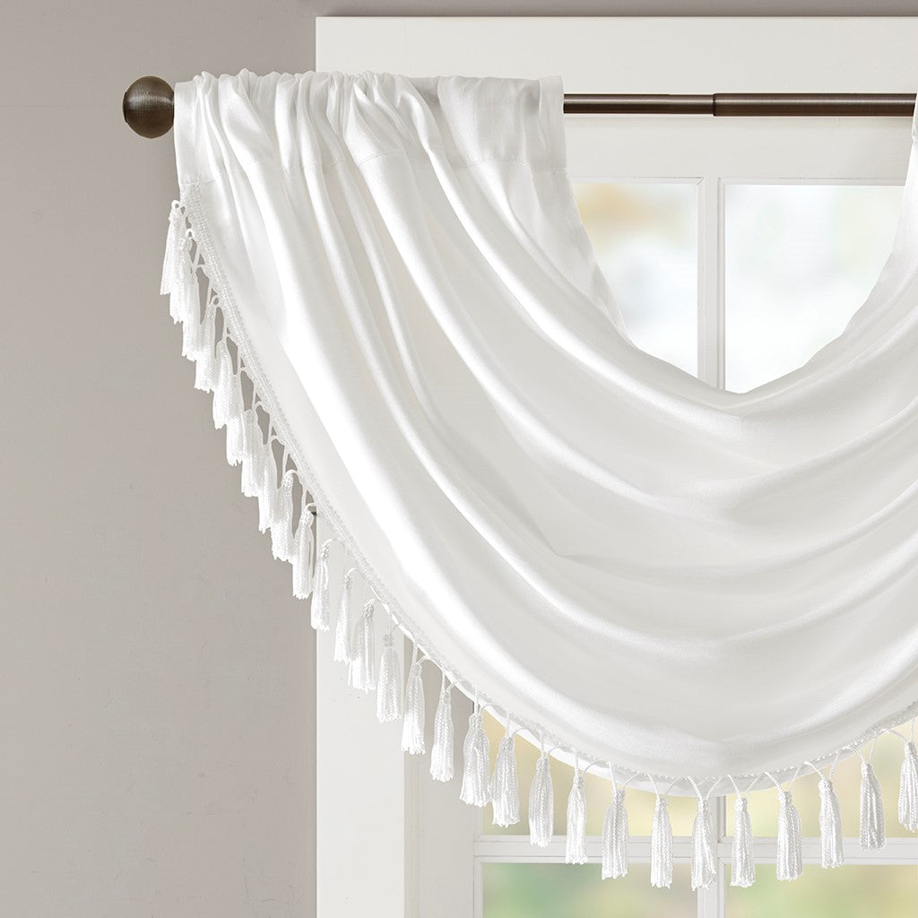 Bring style and sophistication to your windows, with our Elena Waterfall window valance. This classy white valance showcases rich center draping details and a beautiful tassel trim, combined with the faux silk fabric for a rich sheen and stylish update. Features added lining and a rod pocket top finish; fits up to 1.25" diameter rod. Part of our decorative valance collection, this valance is perfect as a stylish addition to any small window or even better as a layering piece to dress up any window panel. This window valance is also OEKO-TEX certified, meaning it does not contain any harmful substances or chemicals, ensuring quality comfort and wellness. Need to purchase 3 valances to create same look as image.