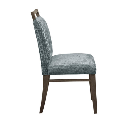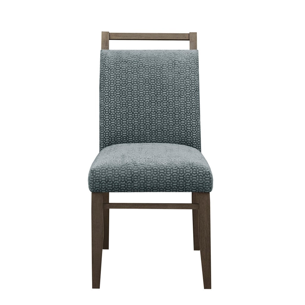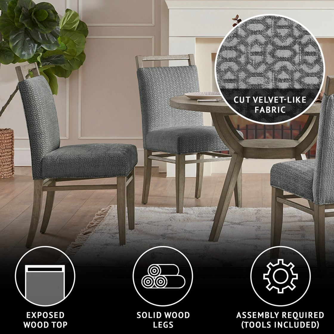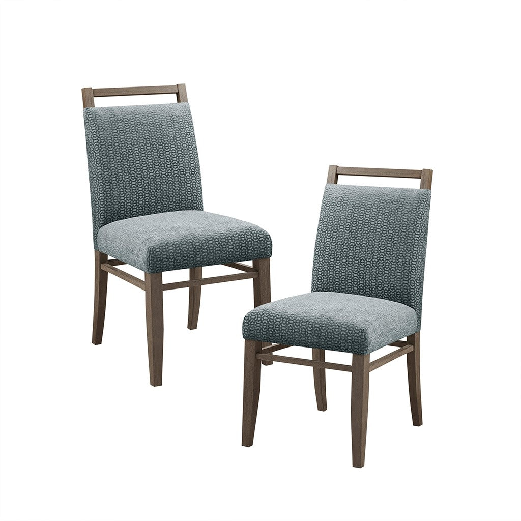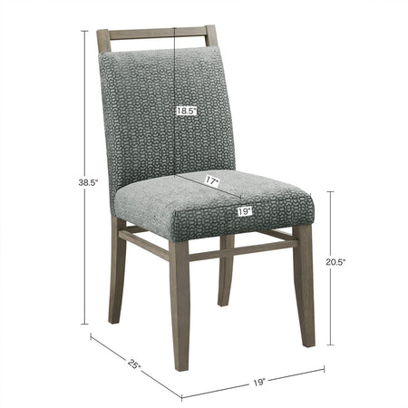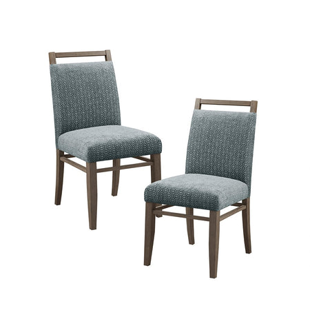 Elevate your dining room with the Madison Park Elmwood Dining Chair Set of 2. Each dining chair is uphosltered in a soft grey fabric that resembles cut velvet and features an exposed wood back to create a stunning modern look. The solid straight wood legs and wood back flaunt a washed grey finish to complement the upholstery. With its refined design, these dining chairs add a contemporary touch to complete your dining room decor. Assembly is required and tools are included.