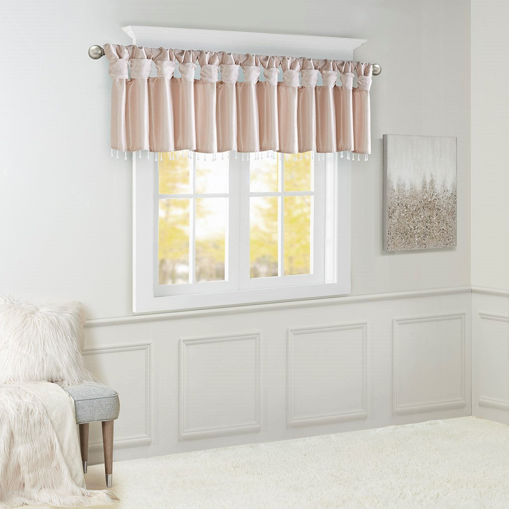 Give your home a decorator's touch with the Madison Park Emilia Window Valance. Made from a faux silk fabric, this elegant window valance features a DIY twist tab top finish that creates rich deep folds, combined with a beautiful bead trim for an alluring charm. Added lining offers more privacy and a fuller appearance, while the luxurious sheen and soft blush tone provides a touch of sophistication to your decor. Easy to hang, this tab top valance updates any decor into subtle glamour. Hanging instructions are included. Fits up to a 2" diameter rod.