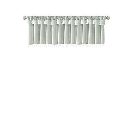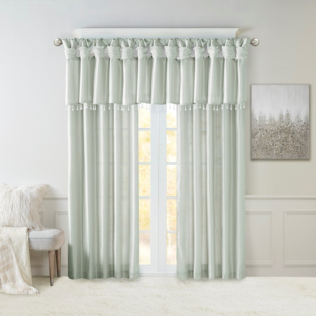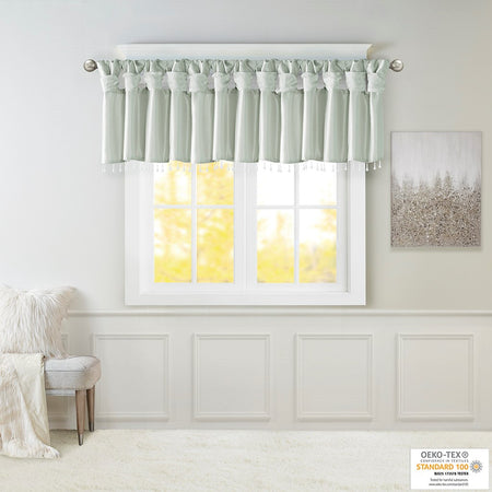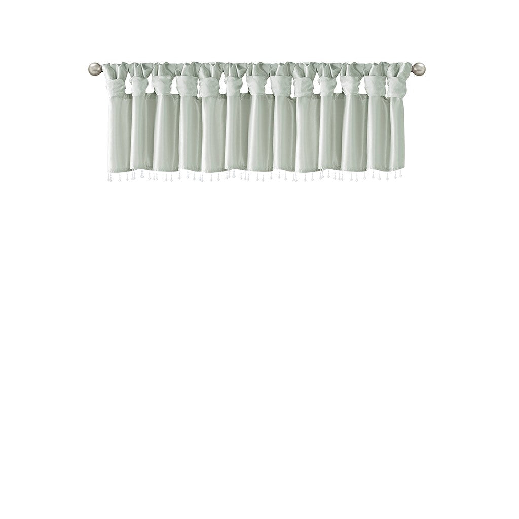 Give your home a decorator's touch with the Madison Park Emilia Window Valance. Made from a faux silk fabric, this elegant window valance features a DIY twist tab top finish that creates rich deep folds, combined with a beautiful bead trim for an alluring charm. Added lining offers more privacy and a fuller appearance, while the luxurious sheen and dusty aqua tone provides a touch of sophistication to your decor. Easy to hang, this tab top valance updates any decor into subtle glamour. Hanging instructions are included. Fits up to a 2" diameter rod.
