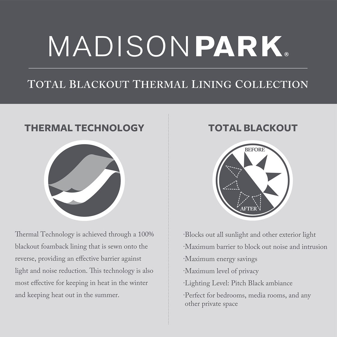 - 100% total blackout provides maximum barrier to block out all exterior light and noise intrusion