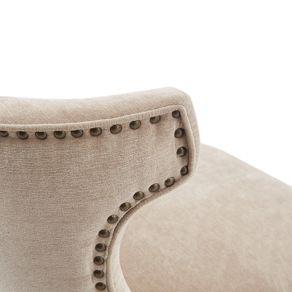 The Madison Park Emmett Swivel Counter Stool adds a charming transitional update to your dining decor. Creating a perfect contrast, this swivel counter stool is upholstered in an elegant beige fabric with a dark coffee wood finish. It also features a bronze nailhead detailing on the back to add an elegant touch, while the bronze metal kick plate provides added durability. Incorporate this swivel counter stool into your dining room or kitchen to add a chic touch to your space. Assembly required and tools are included.