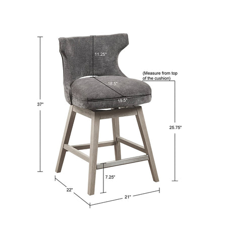 The Madison Park Emmett Swivel Counter Stool brings a chic combination of comfort and style to your kitchen. This counter stool features a low back and is upholstered in a rich charcoal fabric to create a stunning transitional look. The solid wood legs showcase a light grey finish to complement the upholstery. A pewter nail head trim on the open back adds an elegant touch to the design, while the matte silver metal kickplate on the stretcher protects against everyday wear and tear. Able to swivel 360 degrees with no auto return mechanism, this swivel counter stool beautifully completes any kitchen or dining room. Assembly is required and tools are included.