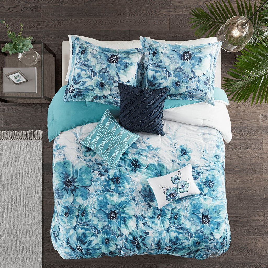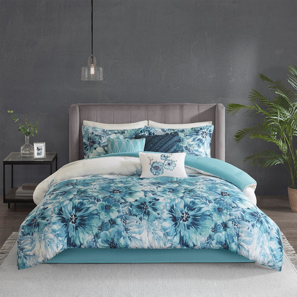 Madison Park's Enza 7 Piece Cotton Printed Comforter Set introduces a beautiful splash of color to your bedroom. A floral watercolor print is gorgeously displayed on the 100% cotton percale comforter and shams, for a stunning casual allure. The solid reverse and bed skirt complement the top of the bed to create a chic coordinated look. Three decorative pillows with embroidered details and fabric manipulation add a charming accent to complete the bedding set. Sure to brighten up your bedroom, this bedding set is also OEKO-TEX certified, meaning it does not contain any harmful substances or chemicals to ensure quality comfort and wellness.