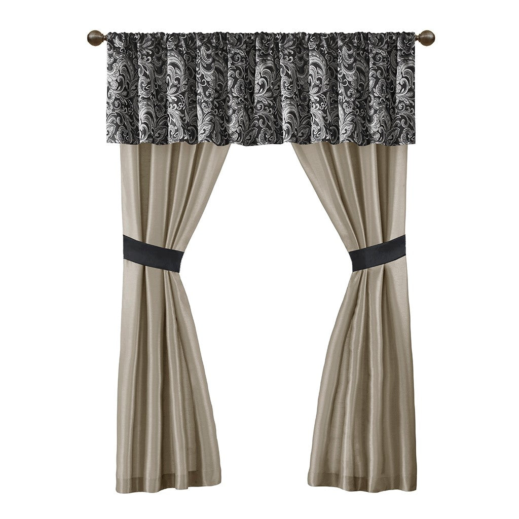 - Each curtain panel is 42x84 inches with coordinating tieback and valance