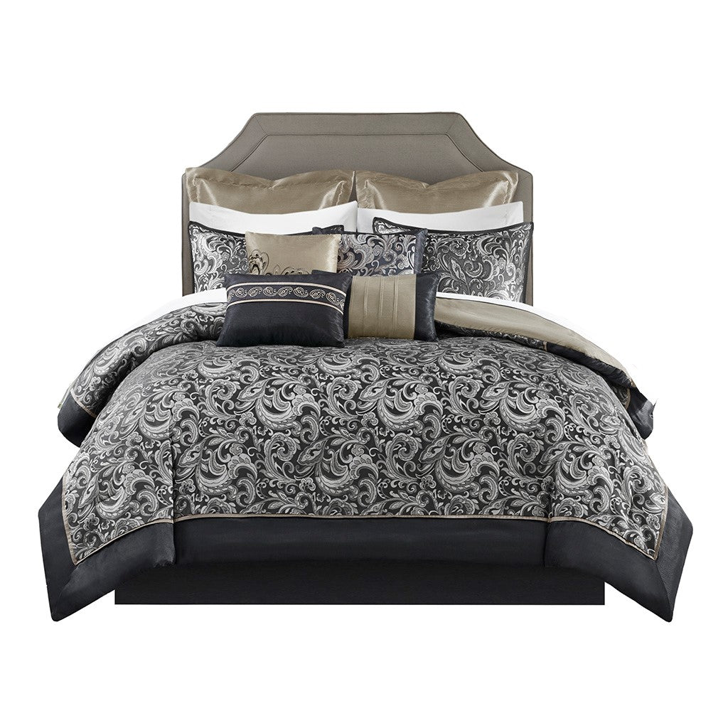 - Elegant 24 piece room in a bag features black/taupe/grey jacquard paisley bedding and matching ensembles for the entire bedroom