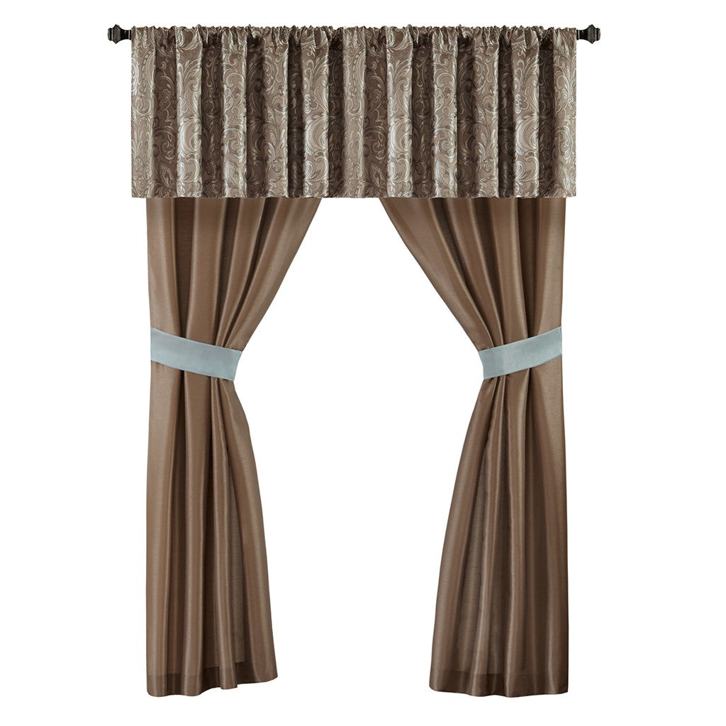 - Each curtain panel is 42x84 inches with coordinating tieback and valance