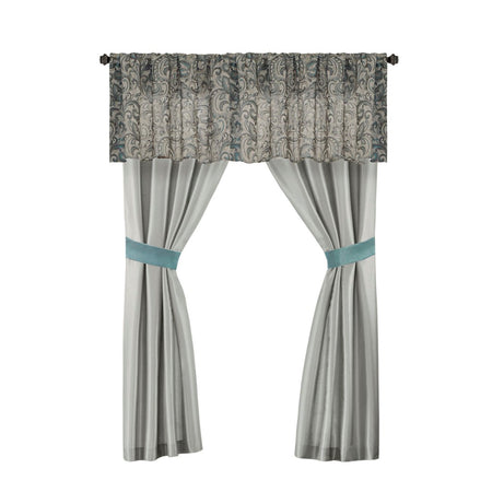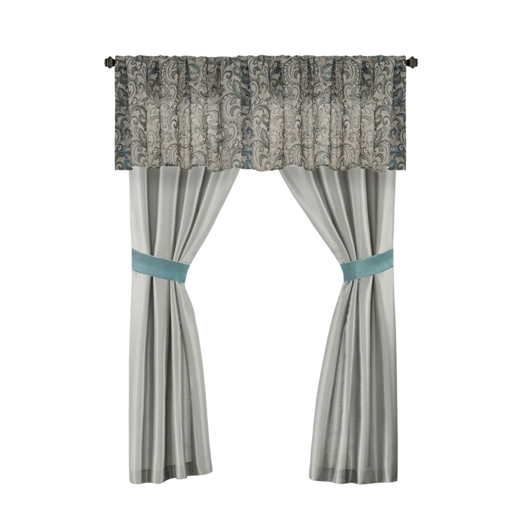 The Madison Park Essentials Brystol 24 Piece Room in a Bag provides a total makeover for your bedroom decor. This traditional comforter flaunts a teal and grey jacquard paisley pattern with an accenting solid teal border to create a luxurious glam look. Matching pillow shams and solid teal Euro shams with 2-inch flanges coordinate beautifully with the elegant comforter. A solid grey bed skirt and 4 decorative pillows with embroidery and pleating details add the finishing touches to this paisley bedding set. Hypoallergenic polyester filling in the comforter and pillows contains no allergens and is treated to be dustproof. A 4 Piece sheet set is also included to complement the comforter and complete the jacquard bedding set. To elevate your bedroom, 4 solid teal window curtains with 2 paisley valances and 2 solid tiebacks are included to perfectly style your windows. Machine washable for easy care, this paisley comforter set may come in rolled or compressed packing and will need to be fluffed up. Use a steam iron to help remove wrinkles easier. Spot clean pillows.