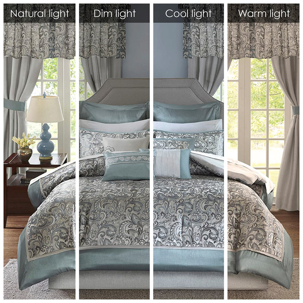 - Elegant 24 piece room in a bag features teal and grey jacquard paisley bedding and matching ensembles for the entire bedroom