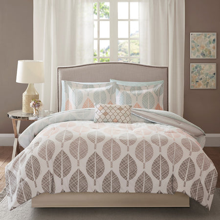 Create a relaxing vibe in your bedroom with the Madison Park Essentials Central Park Comforter Set with Cotton Sheet Set. This bedding set is OEKO-TEX certified, meaning it does not contain any harmful substances or chemicals, ensuring quality comfort and wellness. The comforter features a printed coral and green leaf design in soft and pleasant colors against a white backdrop, for a charming botanical look. A solid grey reverse coordinates perfectly with the bed skirt and matching shams (1 for Twin Sizes) bring the floral motif to the head of the bed. Also included is a complete sheet set that harmonizes beautifully with the rest of the ensemble. An embroidered decorative pillow adds the finishing touch to the look. Bringing the best in health and wellness, this bedding set also features an anti-microbial treatment that provides built-in freshness protection, reducing the growth of odor causing bacteria and keeps fabric lasting longer. This bedding set may come in rolled or compressed packing and will need to be fluffed up. Use a steam iron to help remove wrinkles easier.