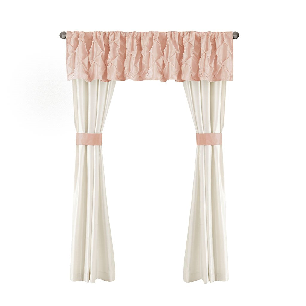 - Each curtain panel is 42x84 inches with coordinating tieback and valance