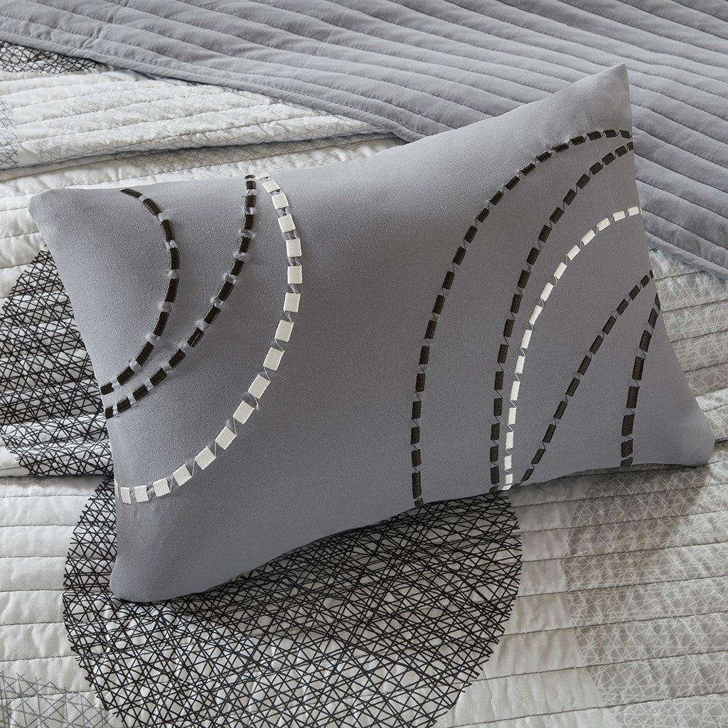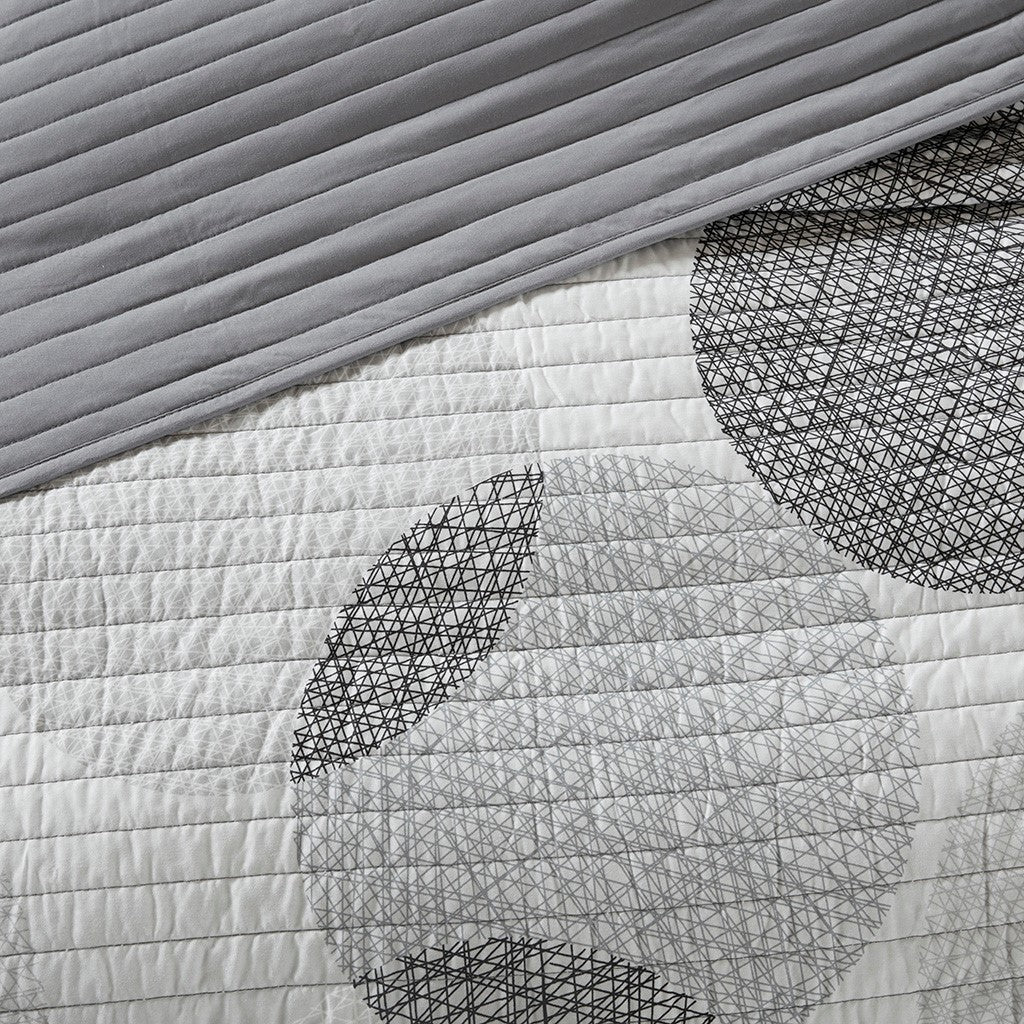 The Madison Park Essentials Knowles Complete Reversible Coverlet and Cotton Sheet Set brings a clean, modern update to your bedroom. A geometric print of dark, white, and light grey circles covers this soft microfiber coverlet, for a refreshing allure. Matching shams (1 for Twin Sizes) repeat the design on the coverlet, while an embroidered decorative pillow provide the finishing touches. Also included is a complete cotton sheet set with a coordinating geometric print. Bringing the best in health and wellness, this bedding set also features an anti-microbial treatment that provides built-in freshness protection, reducing the growth of odor causing bacteria and keeps fabric lasting longer. This bedding set is also OEKO-TEX certified, meaning it does not contain any harmful substances or chemicals, ensuring quality comfort and wellness.