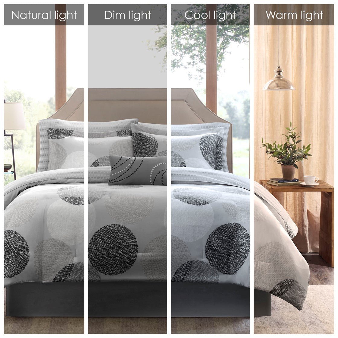 The Madison Park Essentials Knowles Complete Comforter and Cotton Sheet Set brings a clean, modern update to your bedroom. A geometric print of dark, white, and light grey circles covers this soft microfiber comforter, for a refreshing allure. Matching shams (1 for Twin Sizes) repeat the design on the comforter, while a solid grey bed skirt and an embroidered decorative pillow provide the finishing touches. Also included is a complete cotton sheet set with a coordinating geometric print. Bringing the best in health and wellness, this bedding set also features an anti-microbial treatment that provides built-in freshness protection, reducing the growth of odor causing bacteria and keeps fabric lasting longer. This bedding set is also OEKO-TEX certified, meaning it does not contain any harmful substances or chemicals, ensuring quality comfort and wellness. This bedding set may come in rolled or compressed packing and will need to be fluffed up. Use a steam iron to help remove wrinkles easier.