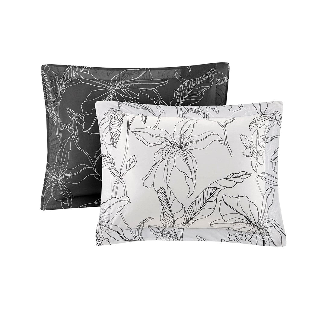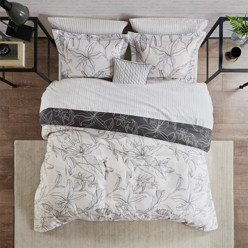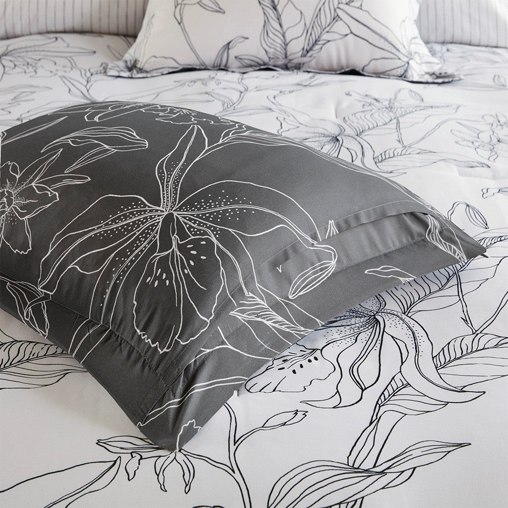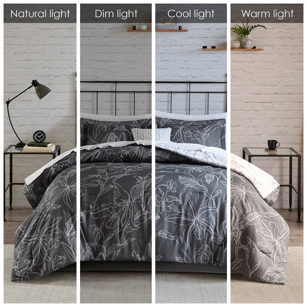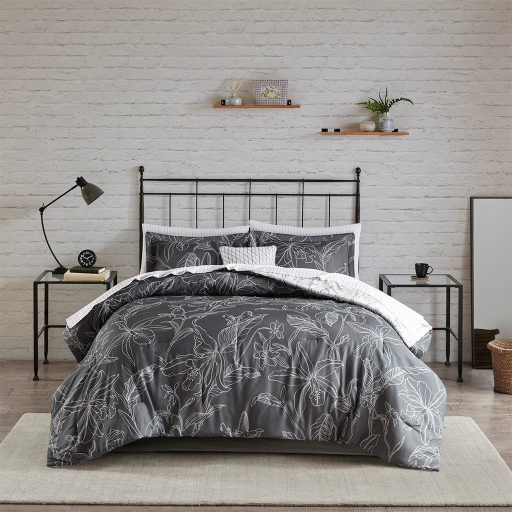 The Madison Park Essentials Lilia Reversible Complete Bedding Set with Cotton Sheet Set offers a modern update to your bedroom. The reversible comforter and shams (1 in Twin sizes) feature a botanic print in charcoal grey on a white base that flips the color scheme on the reverse. A solid grey bedskirt and a square decorative pillow with embroidered details add the perfect finishing touches. Also included is a striped 100% cotton sheet set that coordinates with the comforter set. Bringing the best in health and wellness, this bedding set also features an anti-microbial treatment that provides built-in freshness protection, reducing the growth of odor causing bacteria and keeps fabric lasting longer. This bedding set is also OEKO-TEX certified, meaning it does not contain any harmful substances or chemicals, ensuring quality comfort and wellness. This bedding set may come in rolled or compressed packing and will need to be fluffed up. Use a steam iron to help remove wrinkles easier.