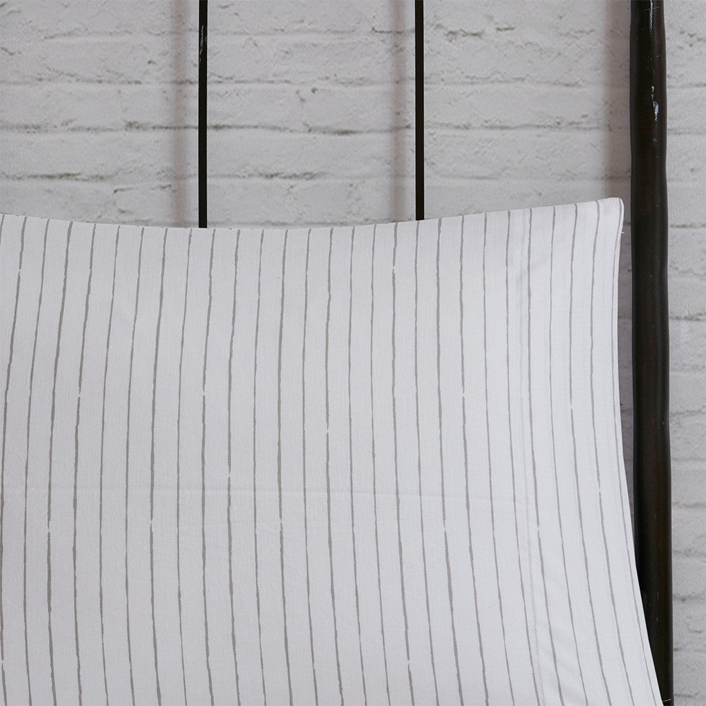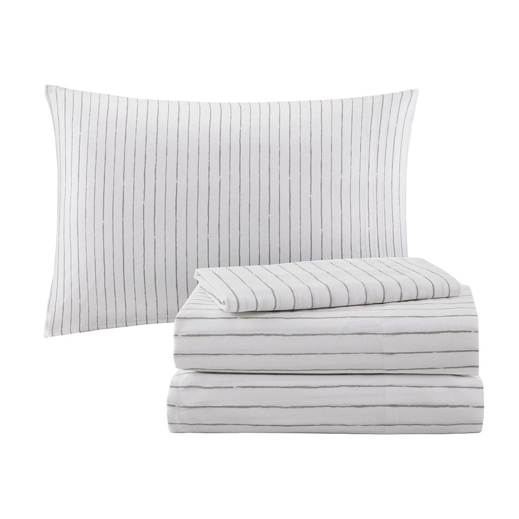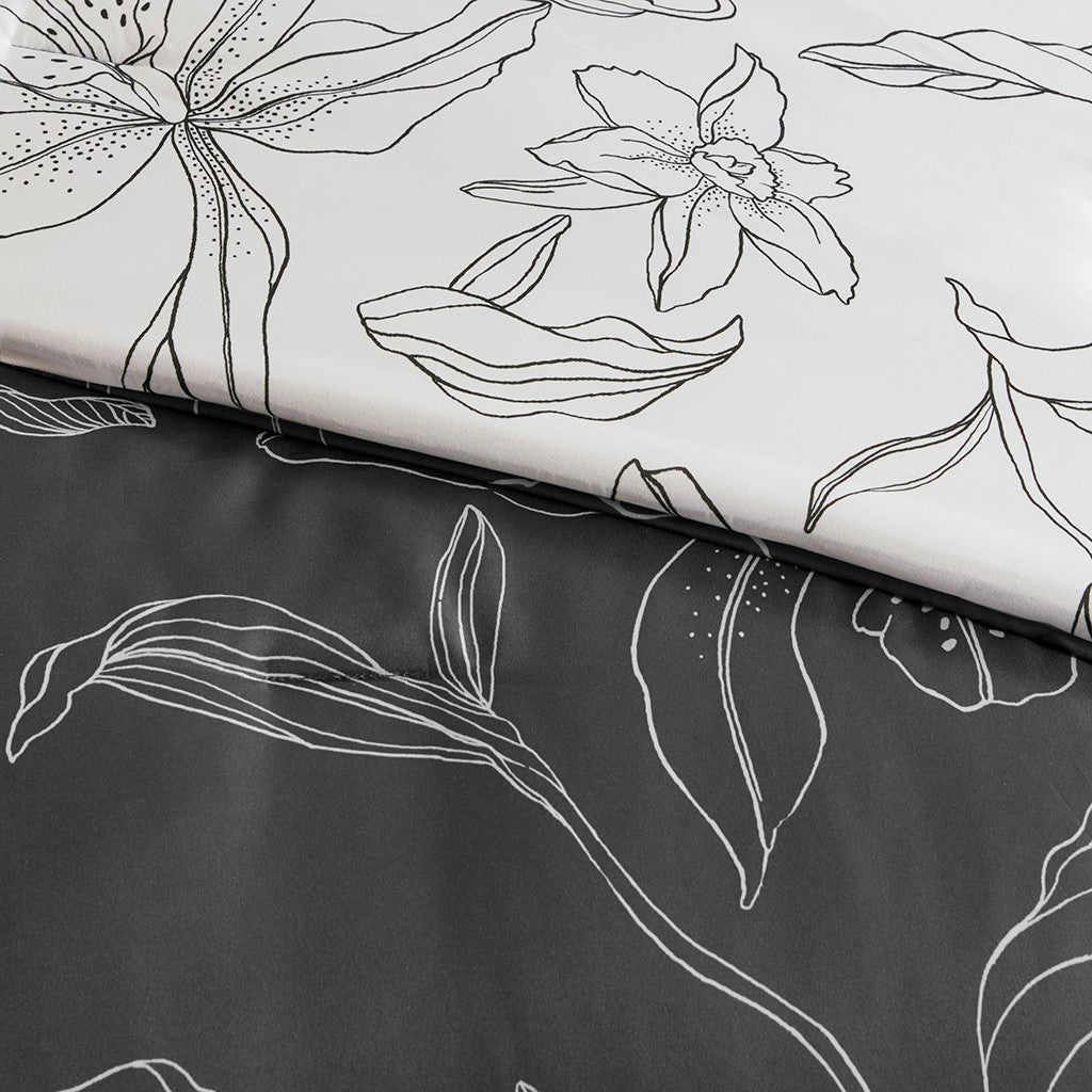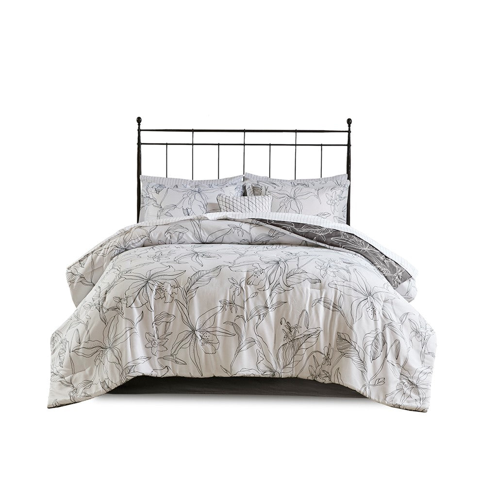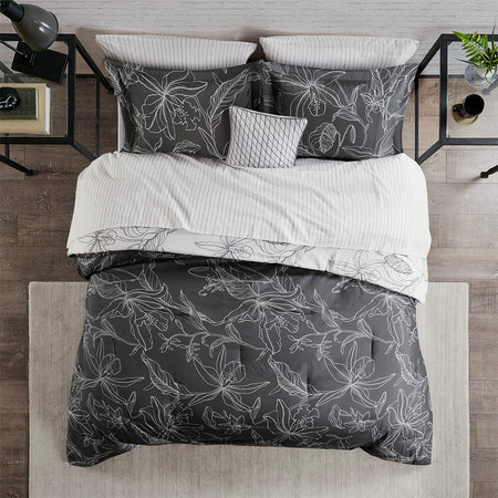 The Madison Park Essentials Lilia Reversible Complete Bedding Set with Cotton Sheet Set offers a modern update to your bedroom. The reversible comforter and shams (1 in Twin sizes) feature a botanic print in charcoal grey on a white base that flips the color scheme on the reverse. A solid grey bedskirt and a square decorative pillow with embroidered details add the perfect finishing touches. Also included is a striped 100% cotton sheet set that coordinates with the comforter set. Bringing the best in health and wellness, this bedding set also features an anti-microbial treatment that provides built-in freshness protection, reducing the growth of odor causing bacteria and keeps fabric lasting longer. This bedding set is also OEKO-TEX certified, meaning it does not contain any harmful substances or chemicals, ensuring quality comfort and wellness. This bedding set may come in rolled or compressed packing and will need to be fluffed up. Use a steam iron to help remove wrinkles easier.