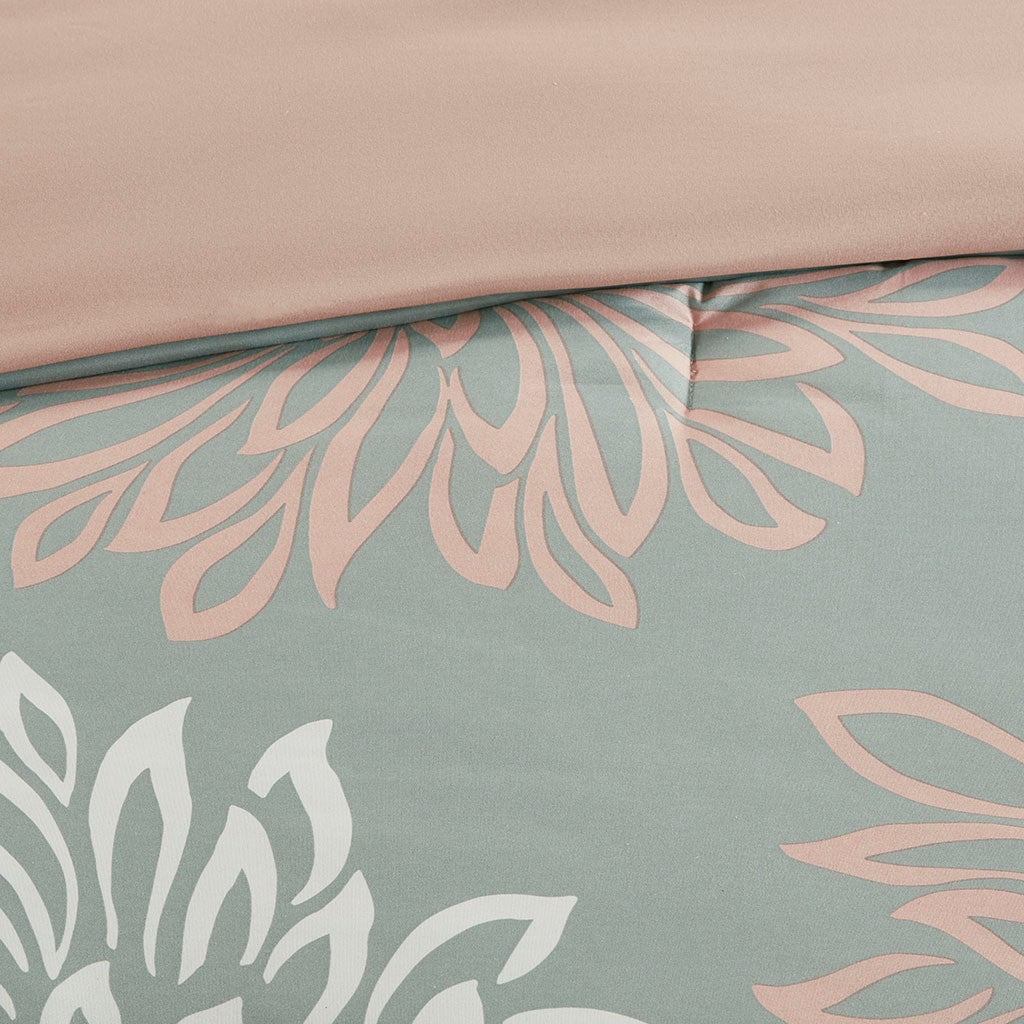 Transform your bedroom into a comfortably casual retreat with the Madison Park Essentials Maible Complete Comforter and Cotton Sheet Set. A beautiful printed floral design, in blush and white hues, adorns the grey with a cast of green ultra-soft microfiber comforter and shams, for an enchanting look. An embroidered decorative pillow and a solid blush bed skirt add chic finishing touches to the bedding set. Also included a 100% cotton sheet set with pillowcases, a flat and a fitted sheet that fits up to a 14-inch (12-inch in Twin size) mattress features a printed design that complements the comforter. Bringing the best in health and wellness, this bedding set also features an anti-microbial treatment that provides built-in freshness protection, reducing the growth of odor causing bacteria and keeps fabric lasting longer. Machine washable for easy care, this complete bed and sheet set provides a complete makeover for your bedroom decor. This bedding set may come in rolled or compressed packing and will need to be fluffed up. Use a steam iron to help remove wrinkles easier.
