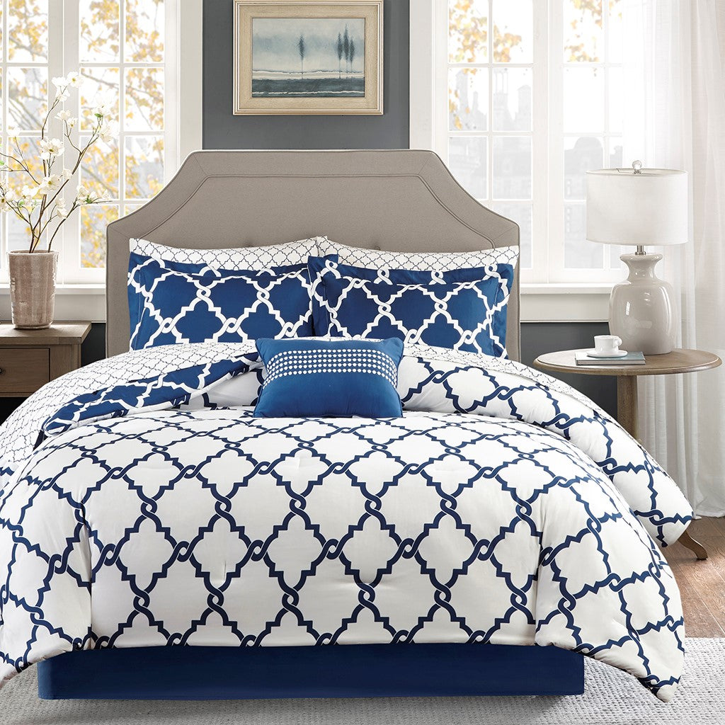 The Madison Park Essentials Merritt Reversible Complete Comforter and Cotton Sheet Set adds a simple yet chic look to your space. The comforter features a fretwork design against a vivid base that flips the color scheme on the reverse, for two distinct modern looks. Matching shams (1 in Twin Sizes) mirror the design on the face of the comforter, while an embroidered decorative pillow and solid bedskirt complete the bedding set. The included 100% cotton printed sheet set features a smaller scale fretwork pattern that complements the comforter. Bringing the best in health and wellness, this bedding set also features an anti-microbial treatment that provides built-in freshness protection, reducing the growth of odor causing bacteria and keeps fabric lasting longer. This bedding set is also OEKO-TEX certified, meaning it does not contain any harmful substances or chemicals, ensuring quality comfort and wellness. This bedding set may come in rolled or compressed packing and will need to be fluffed up. Use a steam iron to help remove wrinkles easier.