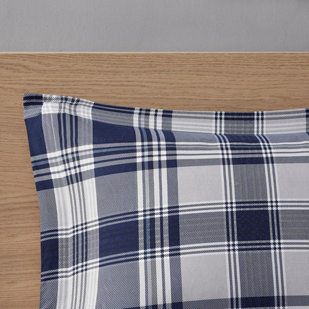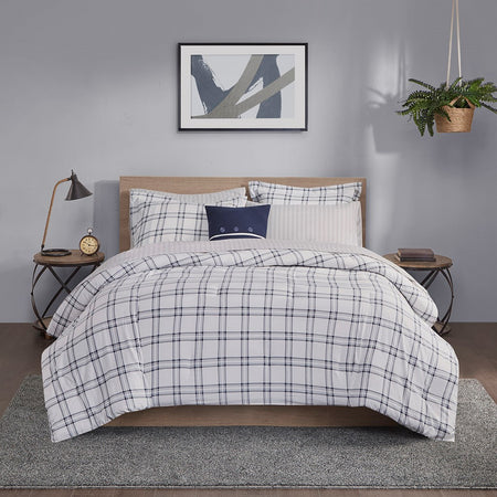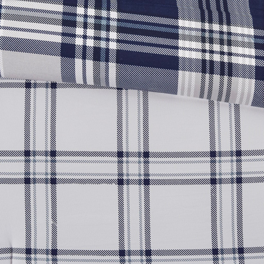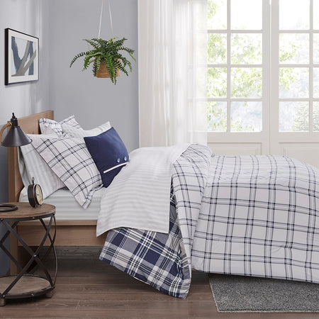 Restyle your bedroom with the Madison Park Essentials Patrick Reversible Comforter Set with Sheet Set. The reversible comforter and shams (1 in Twin Sizes) feature a navy plaid print on the face and a white plaid print on the reverse, for a charming casual look. A coordinating square decorative pillow adds a finishing touch to the comforter. Also included is a grey sheet set, complete with a flat sheet, fitted sheet, and 2 pillowcases (1 for Twin Sizes). Bringing the best in health and wellness, this bedding set also features an anti-microbial treatment that provides built-in freshness protection, reducing the growth of odor causing bacteria and keeps fabric lasting longer. This bedding set is also OEKO-TEX certified, meaning it does not contain any harmful substances or chemicals, ensuring quality comfort and wellness. This bedding set may come in rolled or compressed packing and will need to be fluffed up. Use a steam iron to help remove wrinkles easier.