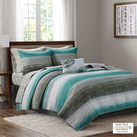 The Madison Park Essentials Saben Complete Reversible Coverlet and Cotton Sheet Set provides a modern update to your bedroom. A watercolor stripe print is beautifully displayed on the ultra-soft microfiber coverlet. The matching shams (1 in Twin Sizes) mirror the pattern of the coverlet, while an embroidered decorative pillow completes the bedding set. A coordinating printed grey cotton sheet set is also included to complement the casual style of the coverlet. Bringing the best in health and wellness, this bedding set also features an anti-microbial treatment that provides built-in freshness protection, reducing the growth of odor causing bacteria and keeps fabric lasting longer. This bedding set is OEKO-TEX certified, meaning it does not contain any harmful substances or chemicals, ensuring quality comfort and wellness.