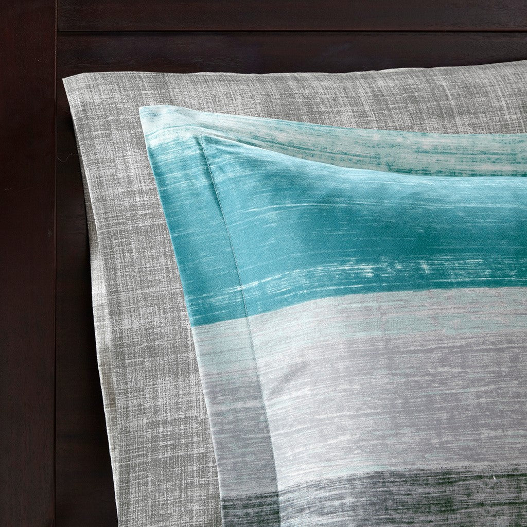 - Casual bedding ensembles featuring water color stripe print comforter and cotton sheet set