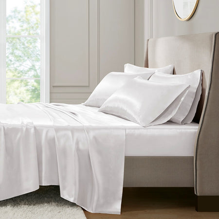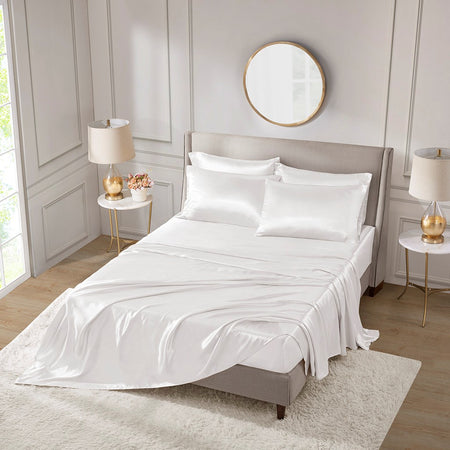 Fall asleep in smooth and luxurious comfort with our wrinkle-free satin sheets. These satin sheets are gentle on your skin and hair, while helping reduce damage causing friction, making this set an essential for your beauty self-care routine. Also included are 2 additional pillowcases to complete your room into full luxury.
