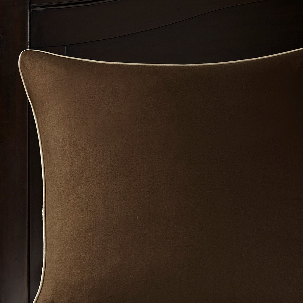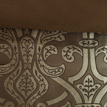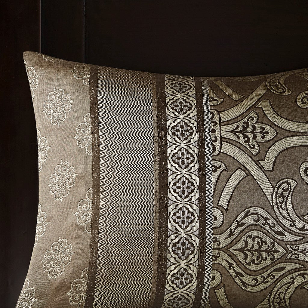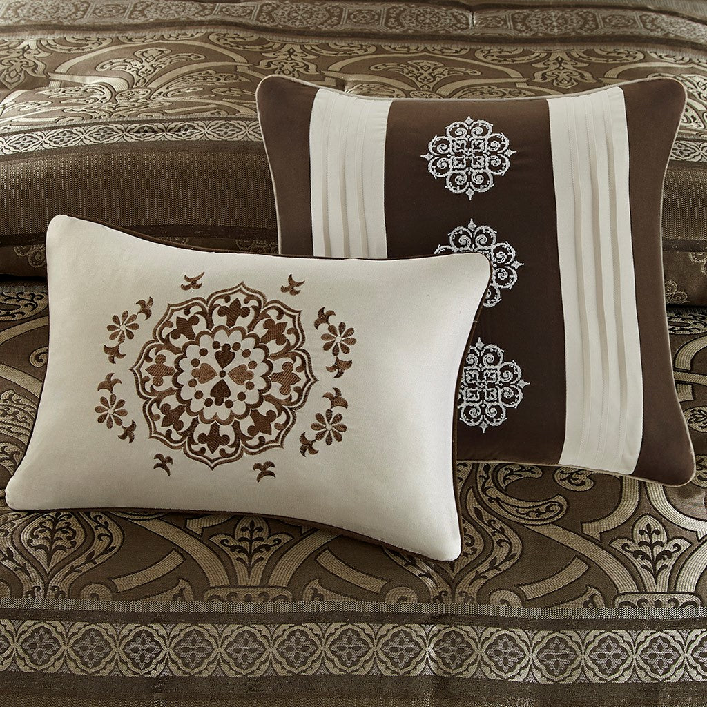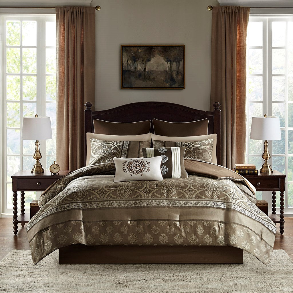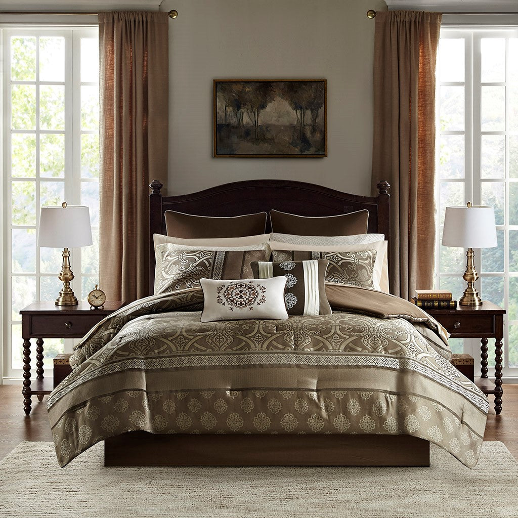 The Madison Park Essentials Zara 16 Piece Jacquard Complete Bedding Set with 2 Sheet Sets offers a luxurious traditional update for your bedroom. An elegant jacquard design, in shades of brown, adorns the face on the comforter and a solid dark brown reverse complements the top of the bed. Two shams and two dark brown Euro shams perfectly complement the comforter, while three decorative pillows with embroidery and pintuck details and a solid brown bedskirt provide the finishing touches. Also included are two complete sheet sets with fitted sheets that fit up to 16-inch mattress depth. One sheet set showcases a medallion print and the other is a solid brown that coordinate back to the jacquard bedding set. Bringing the best in health and wellness, this bedding set also features an anti-microbial treatment that provides built-in freshness protection, reducing the growth of odor causing bacteria and keeps fabric lasting longer. Filled with hypoallergenic filling in the comforter and decorative pillows, this jacquard complete bedding set transforms your entire bedroom with its traditional style and is machine washable for easy care. This bedding set may come in rolled or compressed packing and will need to be fluffed up. Use a steam iron to help remove wrinkles easier.