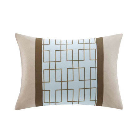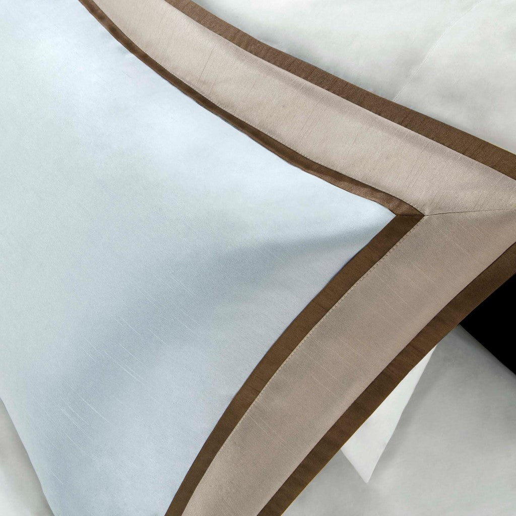 The Genevieve bedding collection creates a neutral feel to your space with a nice light blue to add some color. This set is made from 100% polyester polyoni creating a sheen to the brown, taupe, and blue colorways in this bed. The taupe color creates a large border around the edge of the comforter and a brown border is used inside to really give the blue a pop in the center. The decorative pillows make use of these same borders and colors for a completely matching set while the chocolate brown bedskirt adds some drama with its dark coloring. With these neutral colorways and large borders, this set will be easy to accessorize in any room in your home. Items in the set may come in a rolled or compressed packaging, which will need to be fluffed up or steam ironed before use to remove wrinkles.