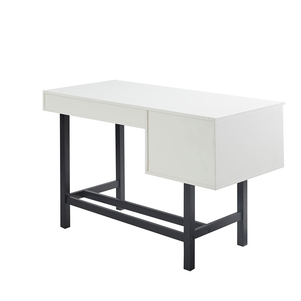 Create the perfect work space in your home office with the Madison Park Kirtley Writing Desk with Drawer. This writing desk features a high gloss white table top with a natural wood grain finish on the front panel to create a chic distressed look. The solid wood legs showcase a matte black metal finish that adds a bold contrasting touch to the design. A single drawer with a black pull bar provides ample space for your writing essentials. With its unique modern charm, this writing desk transforms your home office into a stylish and diligent work space. Leg assembly is required and tools are included.